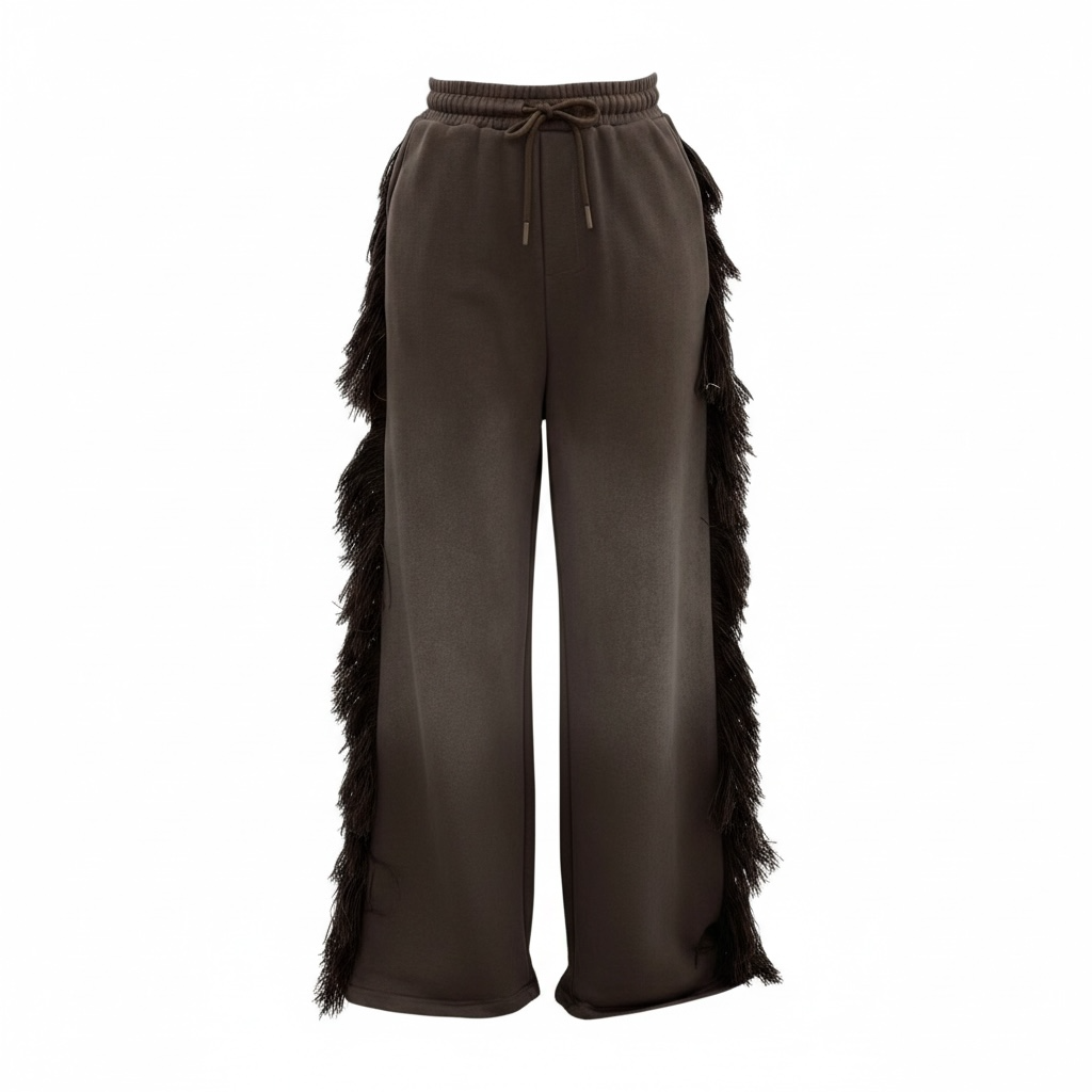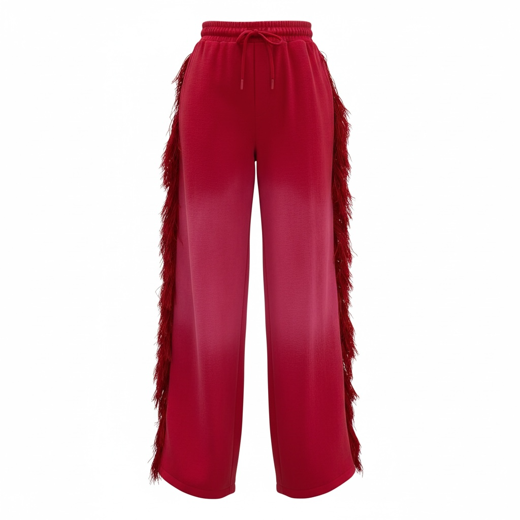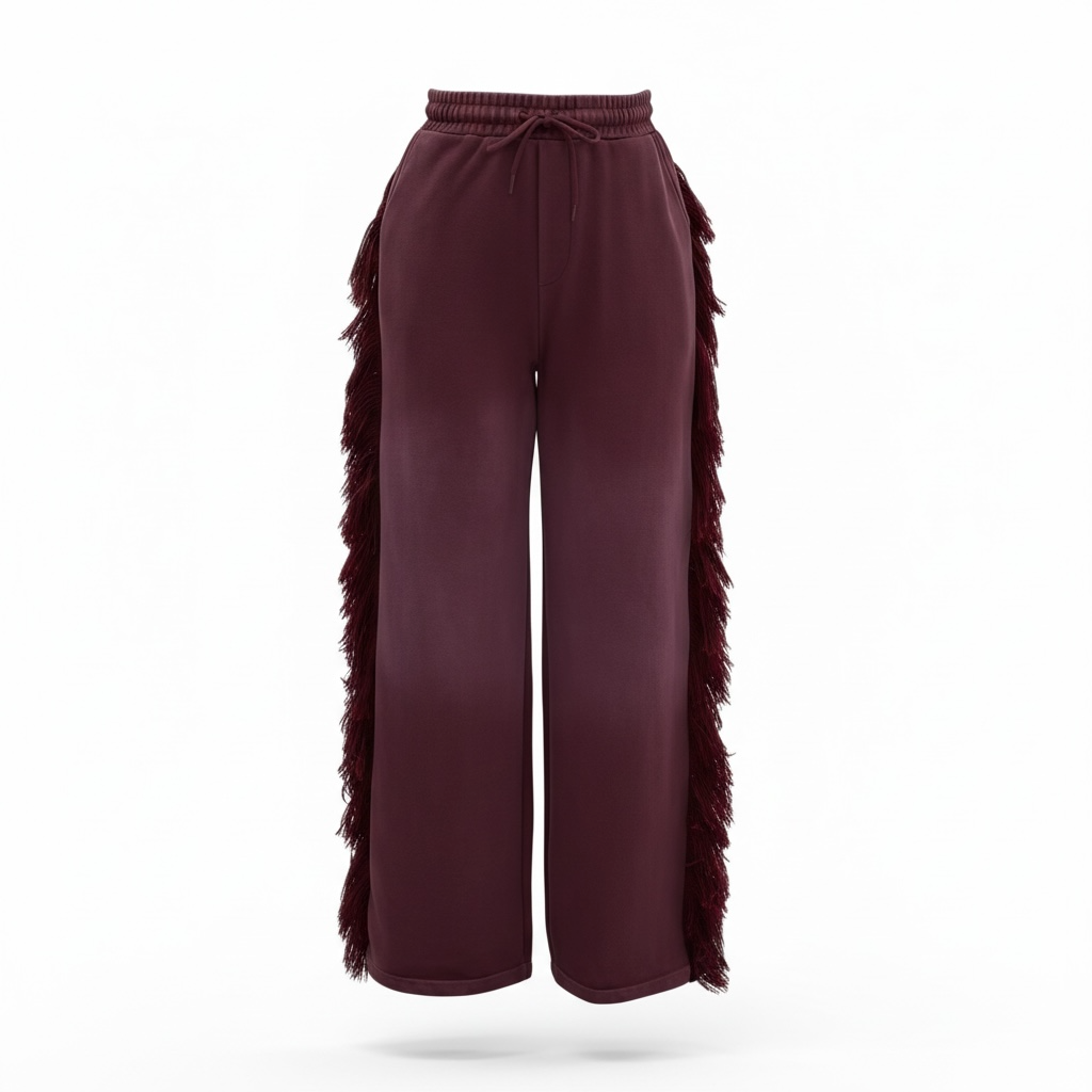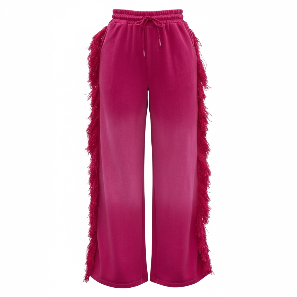 FRINGE PANTS. The pants have a relaxed wide fit. The waistband is thick and meant to cinch in your waistline. The dramatic fringe is a premium thick and fluffy thread meant to draw attention to your shape for an hour glass illusion. One butt pocket. Hand pockets. These pants alone are a statement piece.