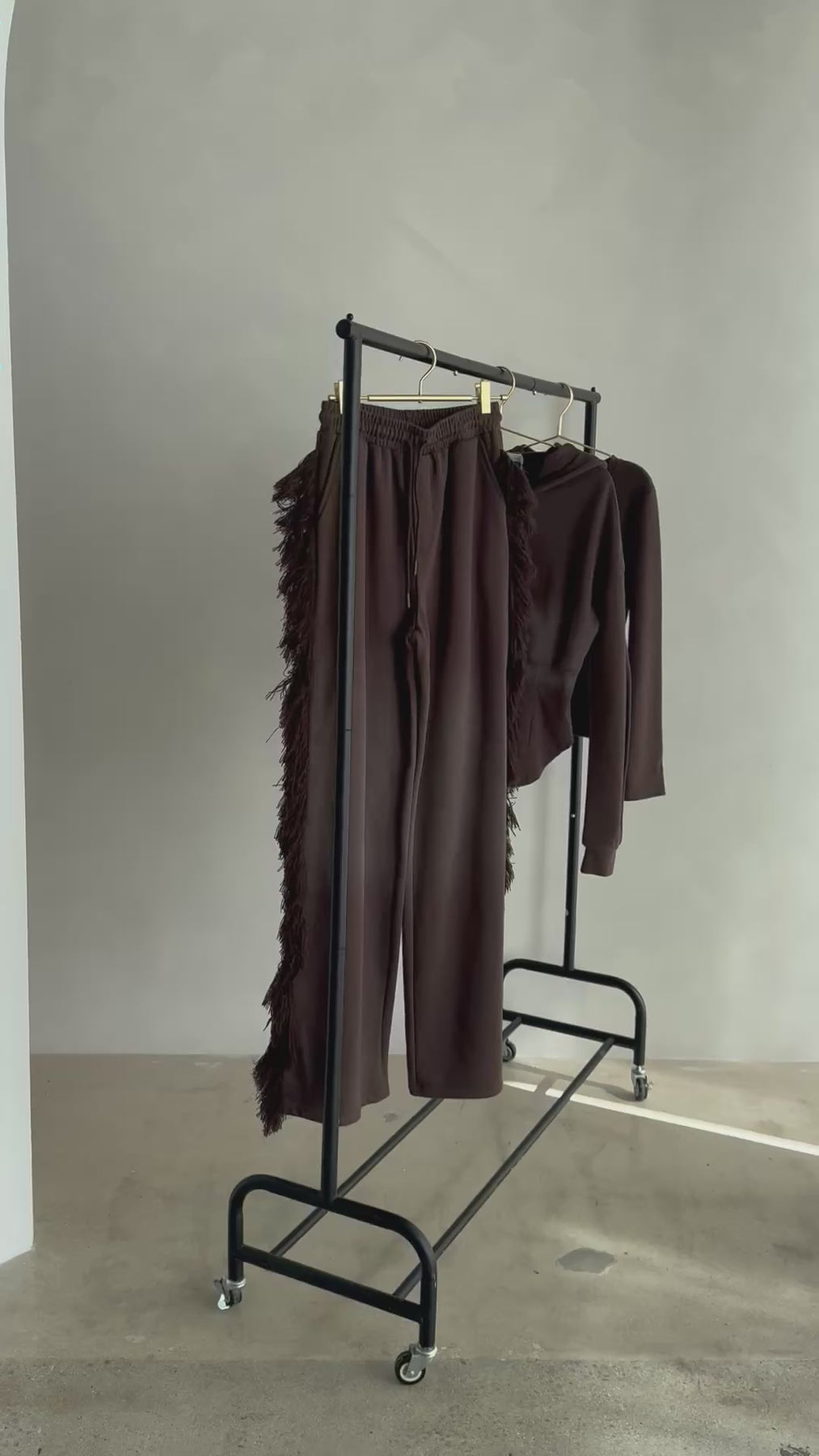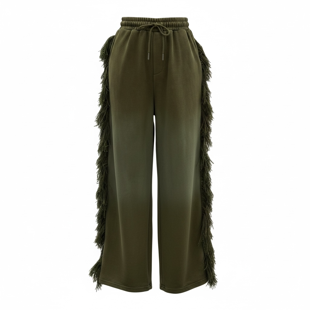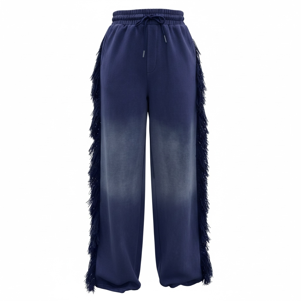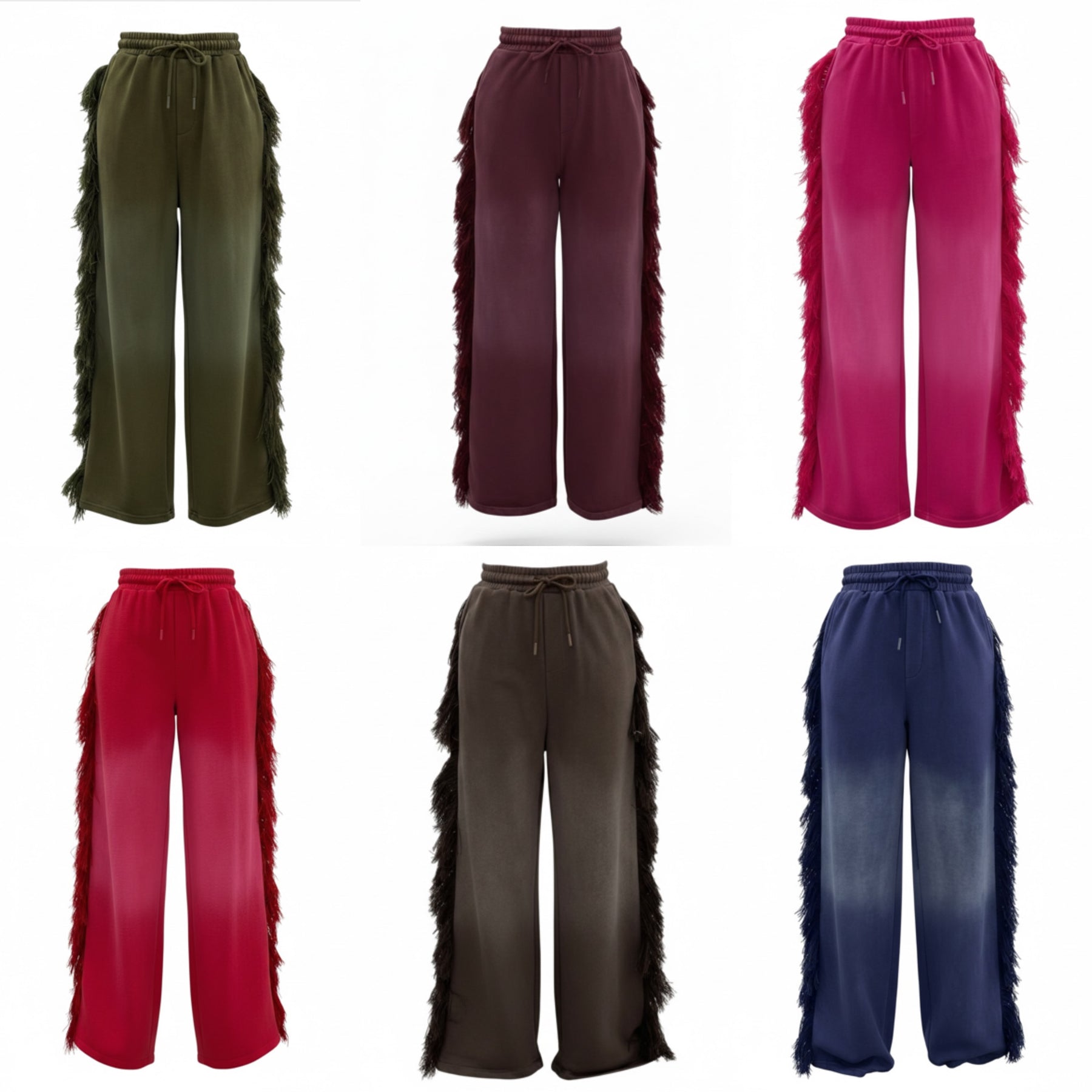 FRINGE PANTS. The pants have a relaxed wide fit. The waistband is thick and meant to cinch in your waistline. The dramatic fringe is a premium thick and fluffy thread meant to draw attention to your shape for an hour glass illusion. One butt pocket. Hand pockets. These pants alone are a statement piece.