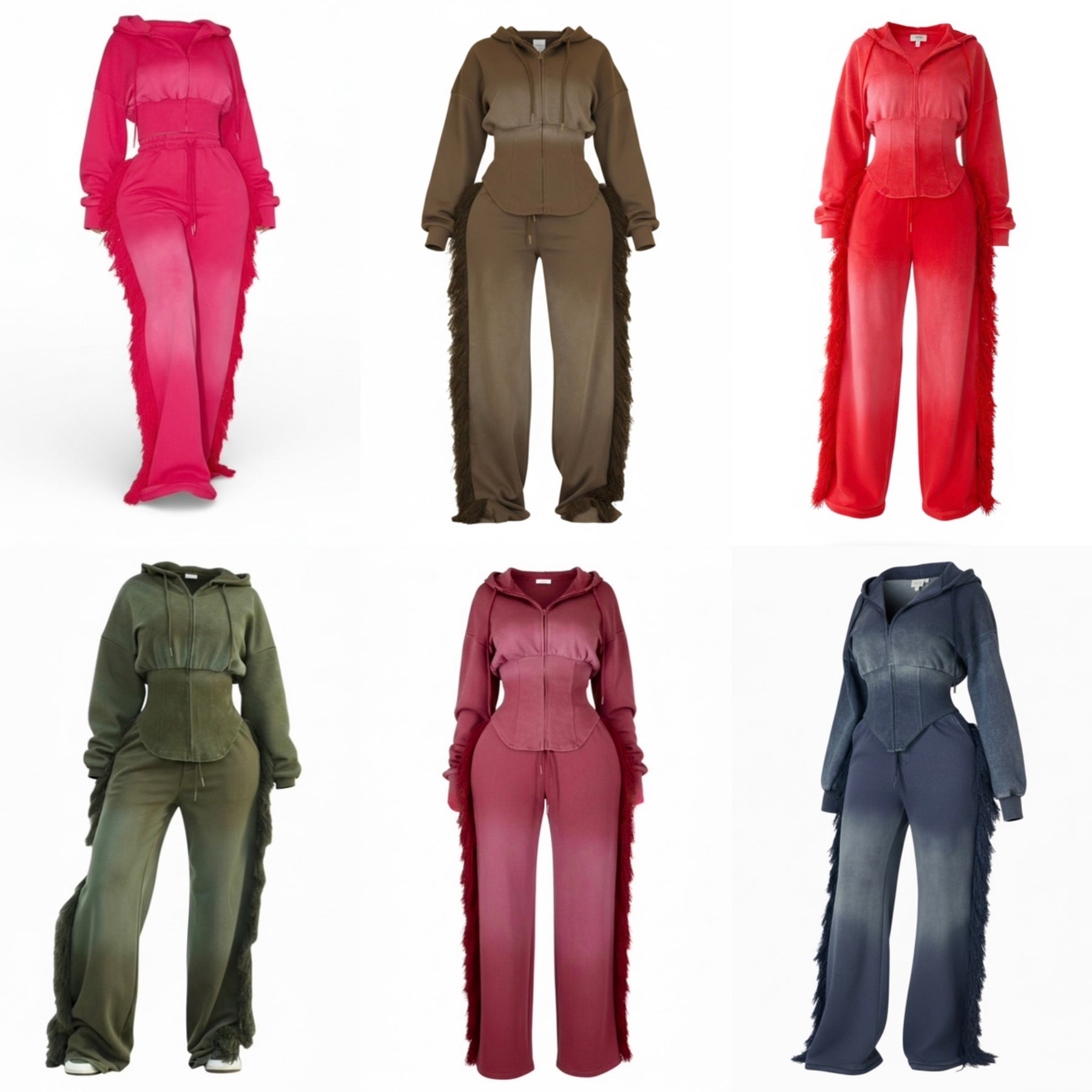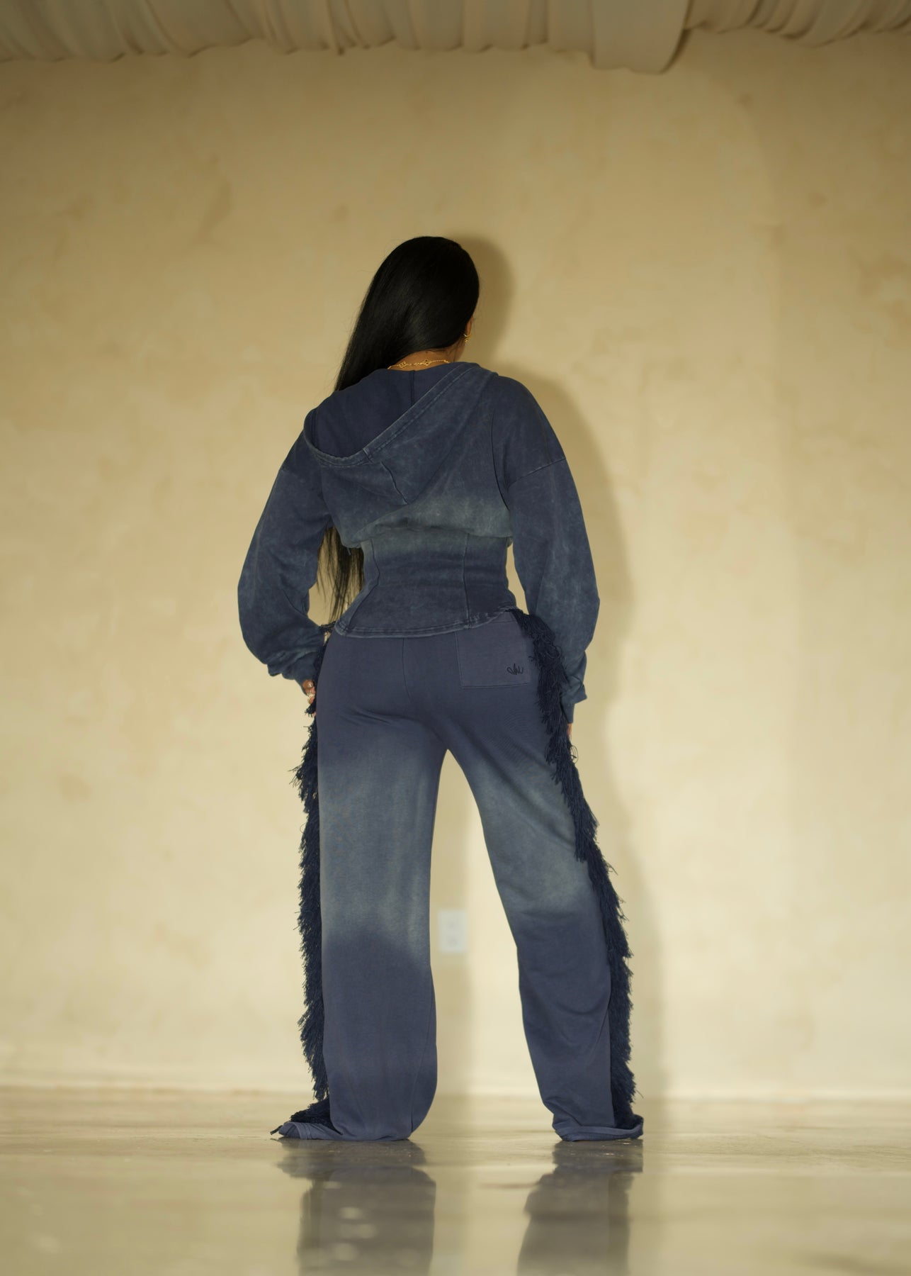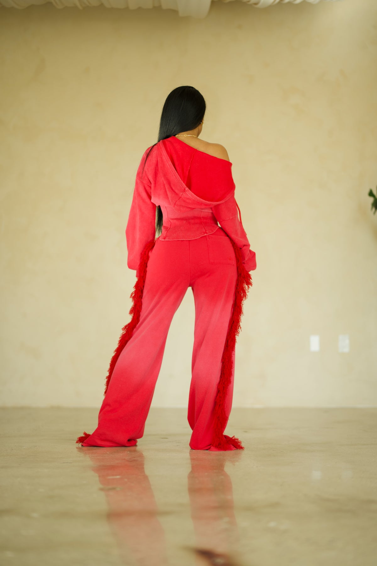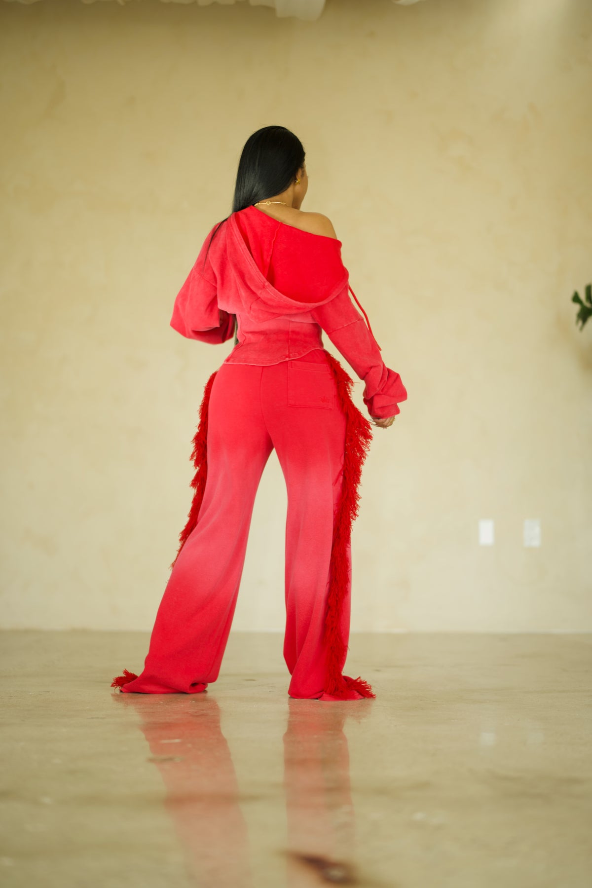 FRINGE PANTS. The pants have a relaxed wide fit. The waistband is thick and meant to cinch in your waistline. The dramatic fringe is a premium thick and fluffy thread meant to draw attention to your shape for an hour glass illusion. One butt pocket. Hand pockets. These pants alone are a statement piece.