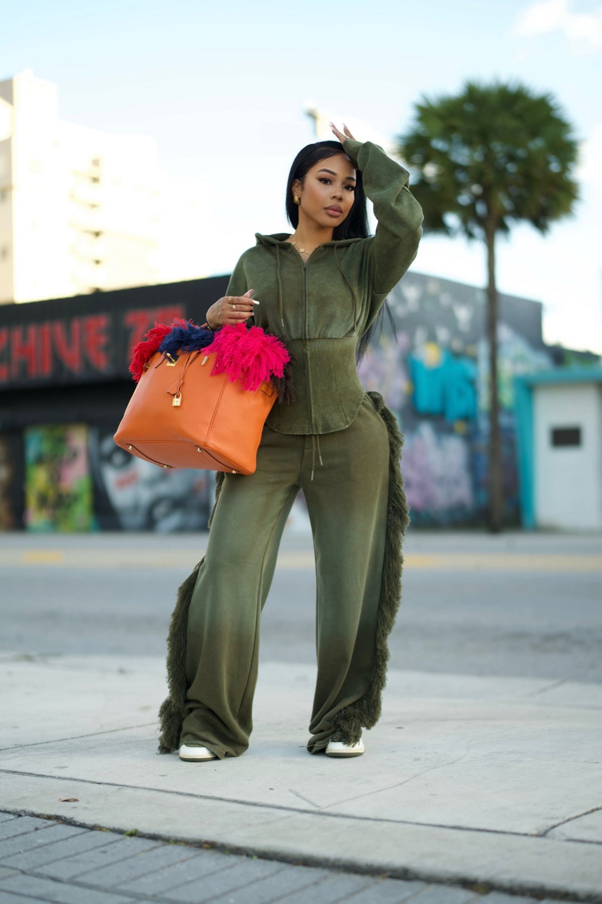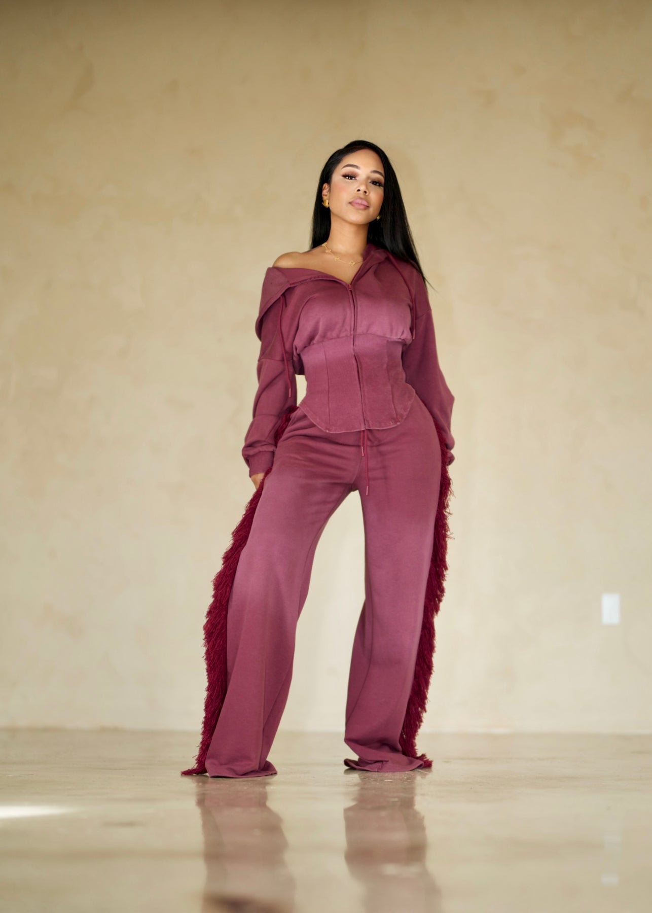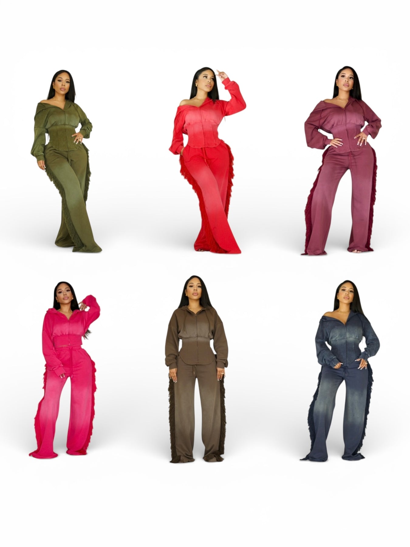 FRINGE PANTS. The pants have a relaxed wide fit. The waistband is thick and meant to cinch in your waistline. The dramatic fringe is a premium thick and fluffy thread meant to draw attention to your shape for an hour glass illusion. One butt pocket. Hand pockets. These pants alone are a statement piece.