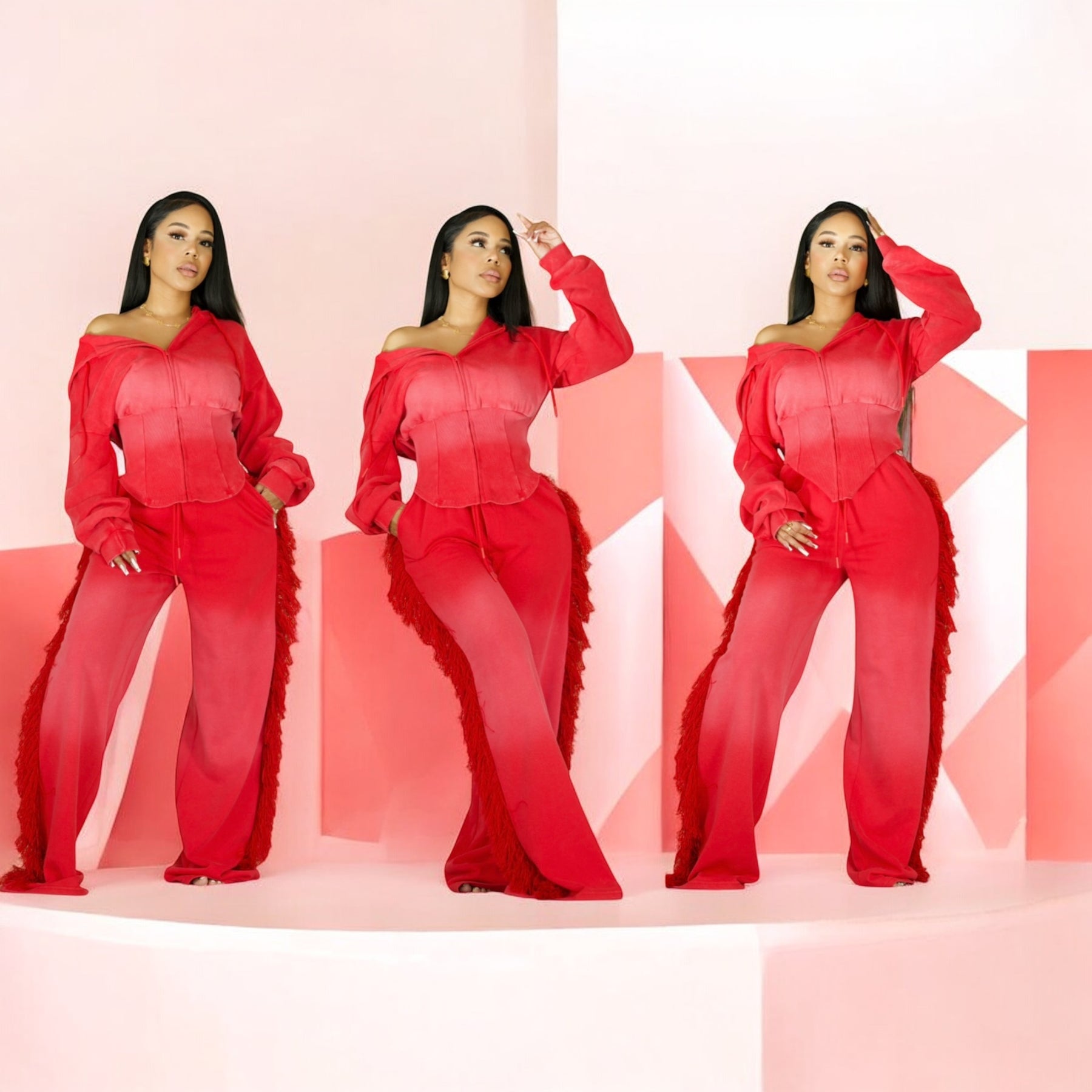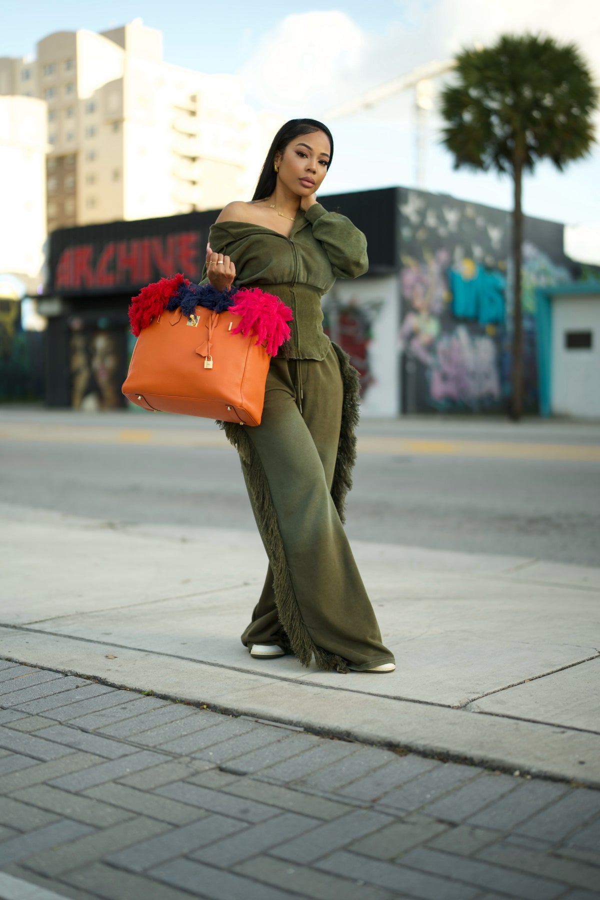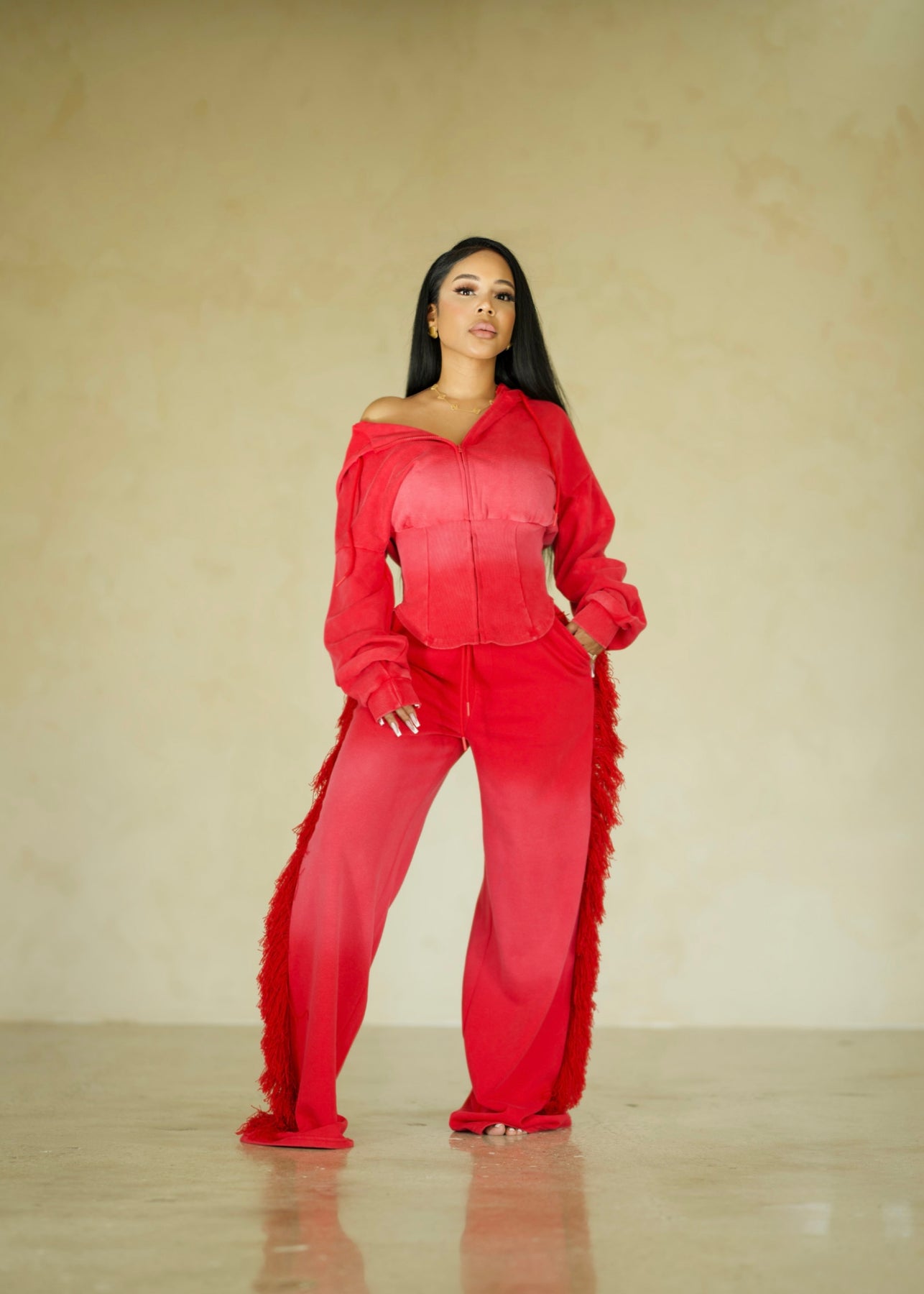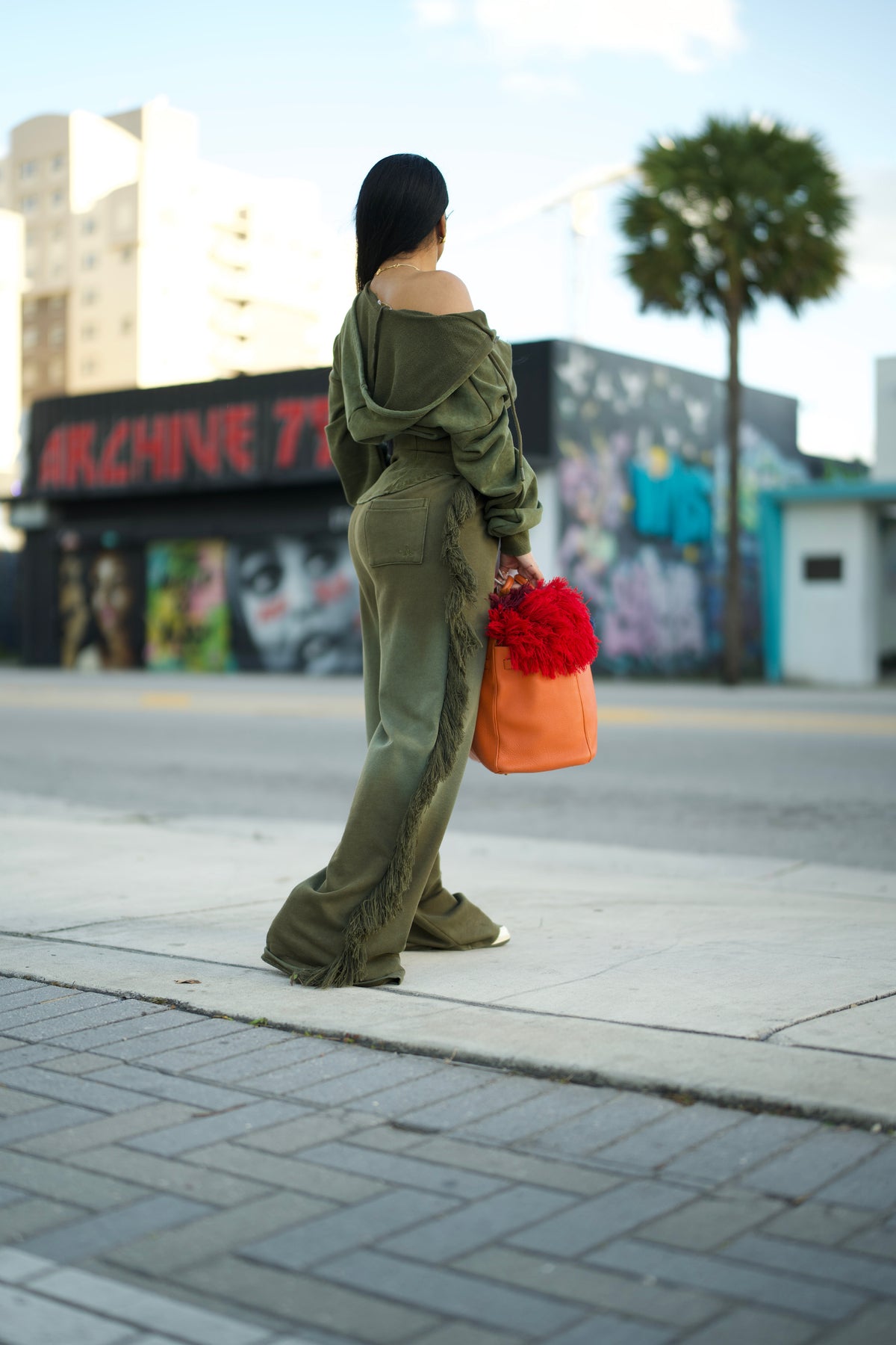 FRINGE PANTS. The pants have a relaxed wide fit. The waistband is thick and meant to cinch in your waistline. The dramatic fringe is a premium thick and fluffy thread meant to draw attention to your shape for an hour glass illusion. One butt pocket. Hand pockets. These pants alone are a statement piece.
