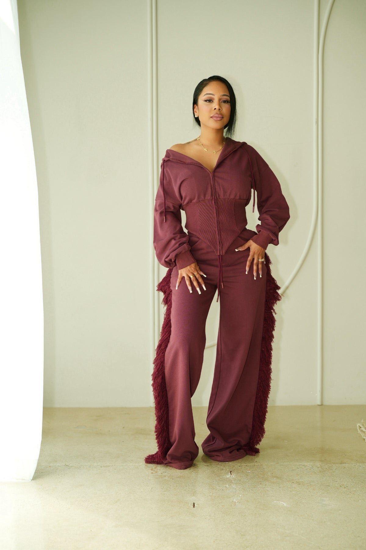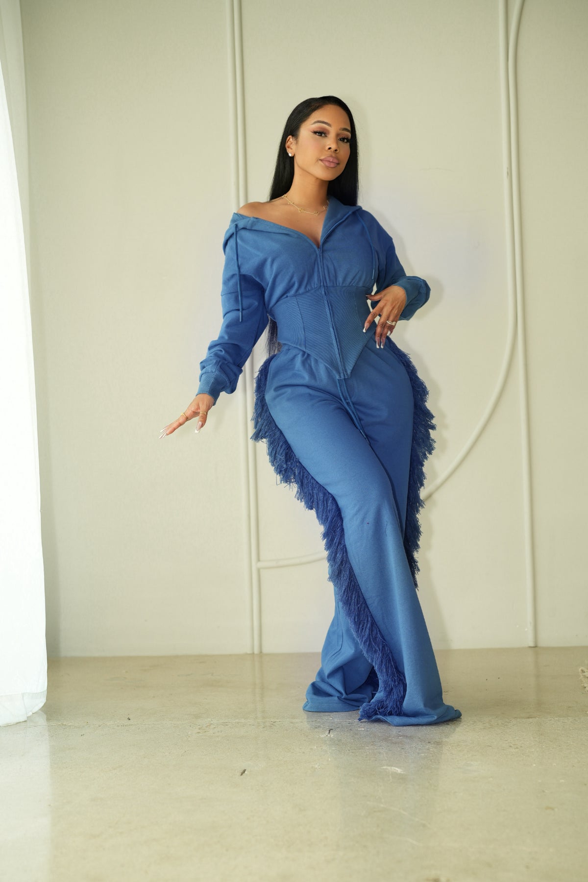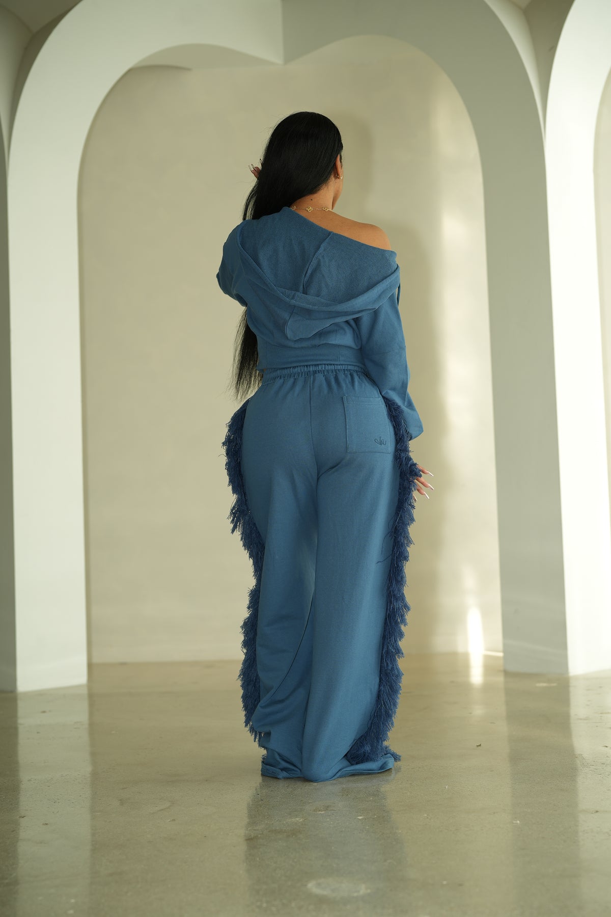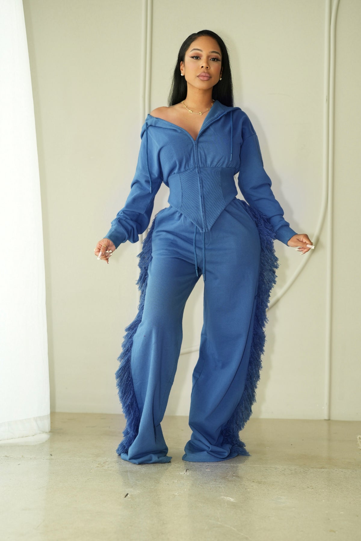 FRINGE PANTS. The pants have a relaxed wide fit. The waistband is thick and meant to cinch in your waistline. The dramatic fringe is a premium thick and fluffy thread meant to draw attention to your shape for an hour glass illusion. One butt pocket. Hand pockets. These pants alone are a statement piece.