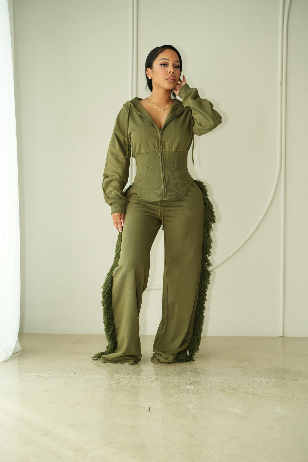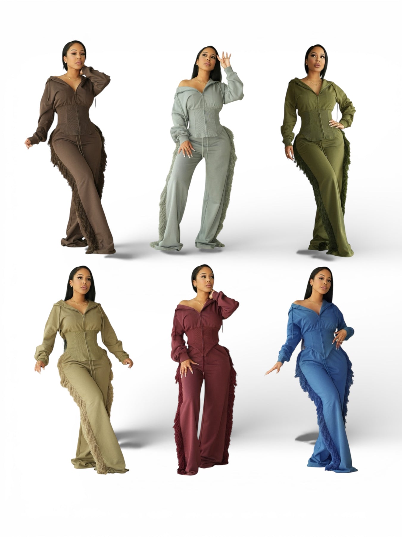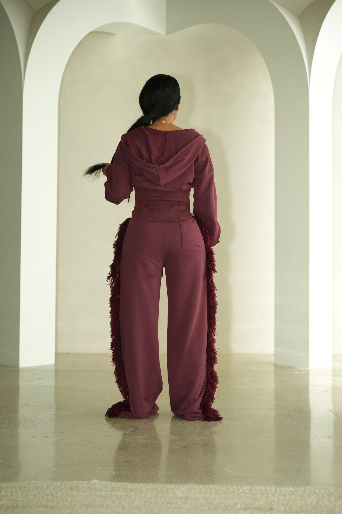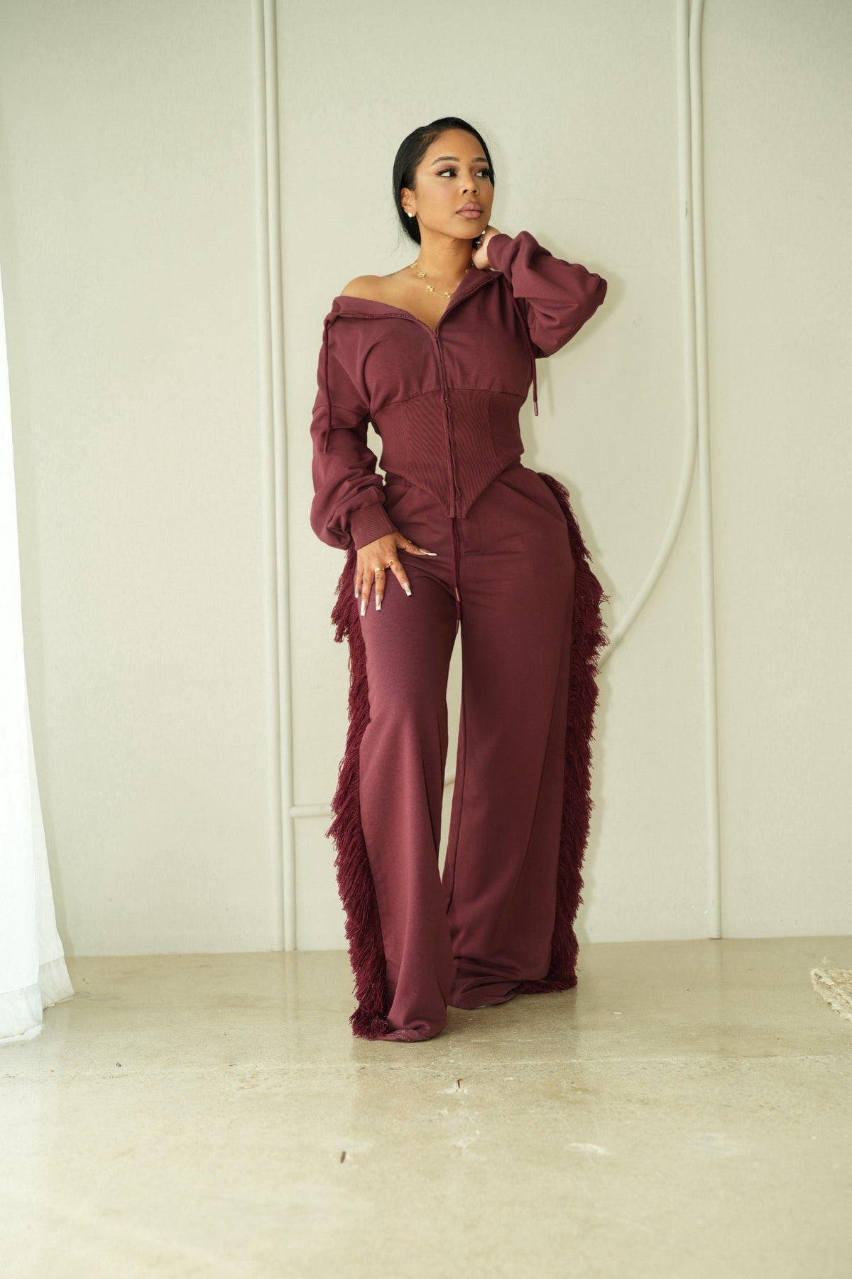 FRINGE PANTS. The pants have a relaxed wide fit. The waistband is thick and meant to cinch in your waistline. The dramatic fringe is a premium thick and fluffy thread meant to draw attention to your shape for an hour glass illusion. One butt pocket. Hand pockets. These pants alone are a statement piece.