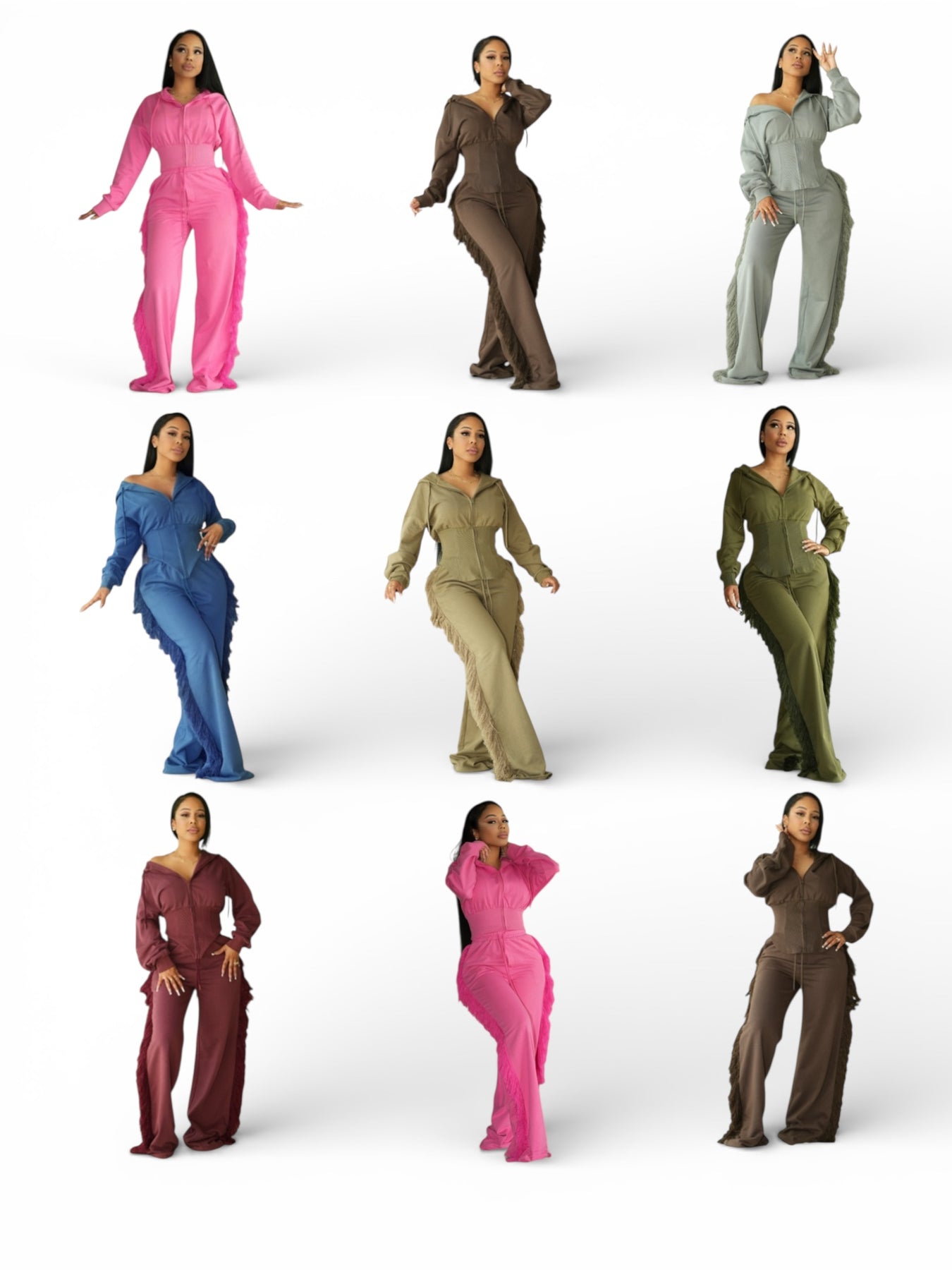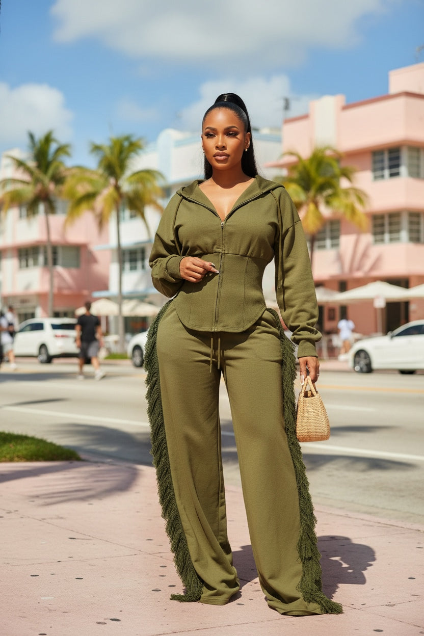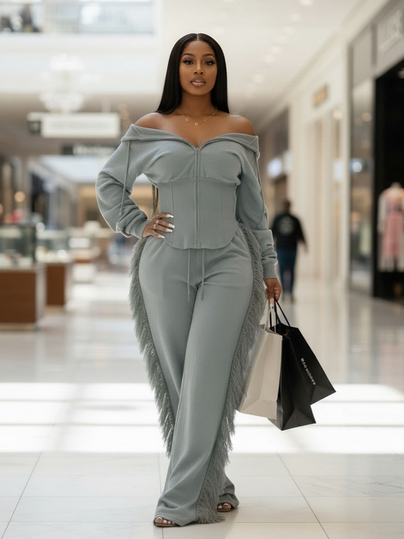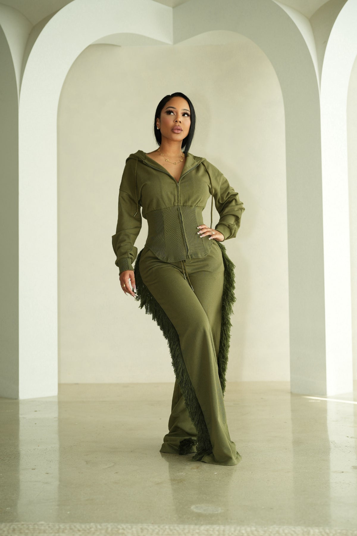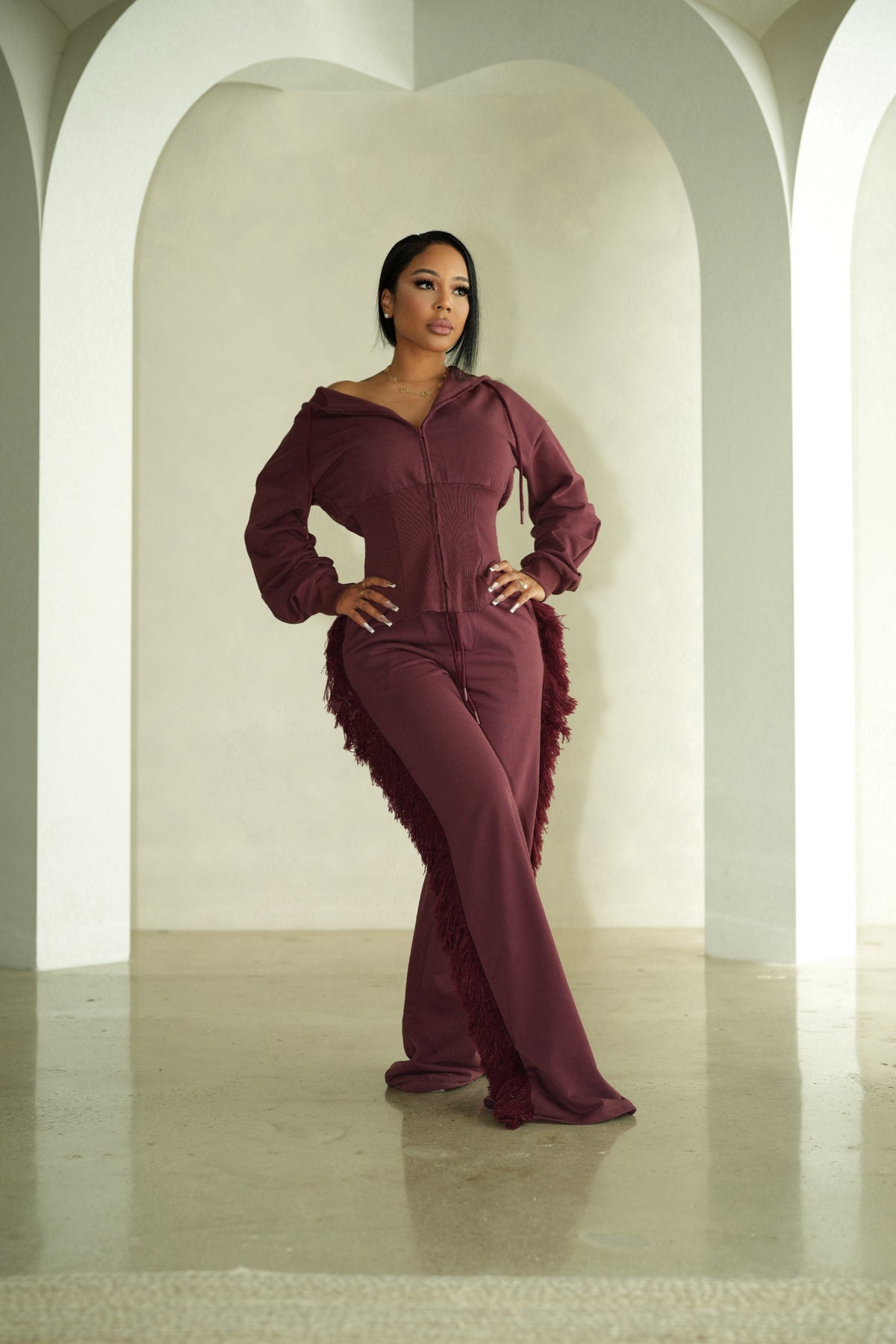 FRINGE PANTS. The pants have a relaxed wide fit. The waistband is thick and meant to cinch in your waistline. The dramatic fringe is a premium thick and fluffy thread meant to draw attention to your shape for an hour glass illusion. One butt pocket. Hand pockets. These pants alone are a statement piece.