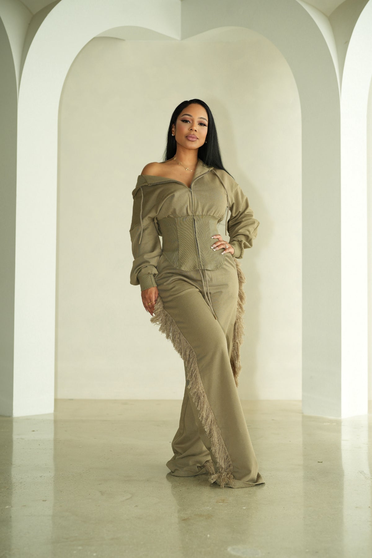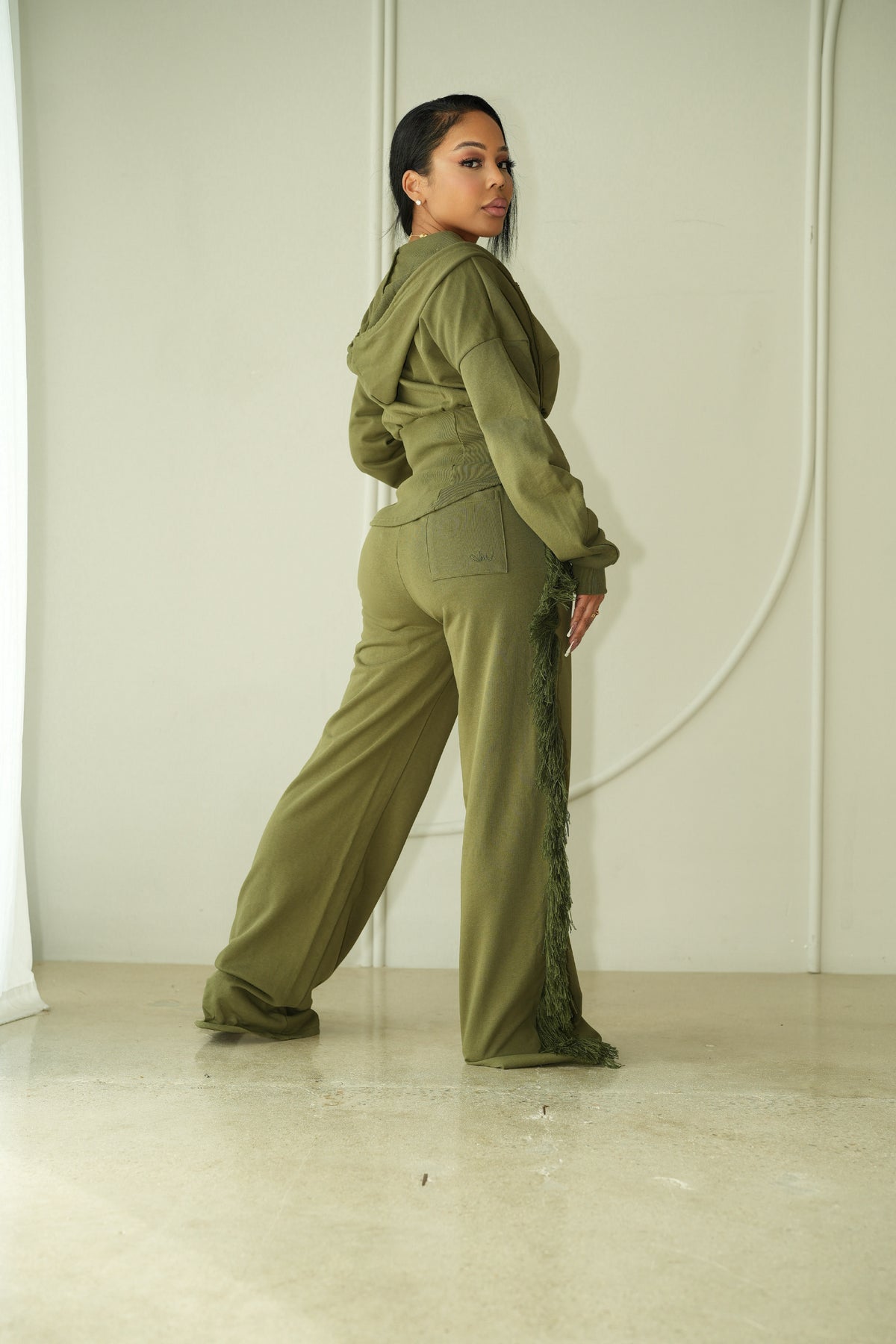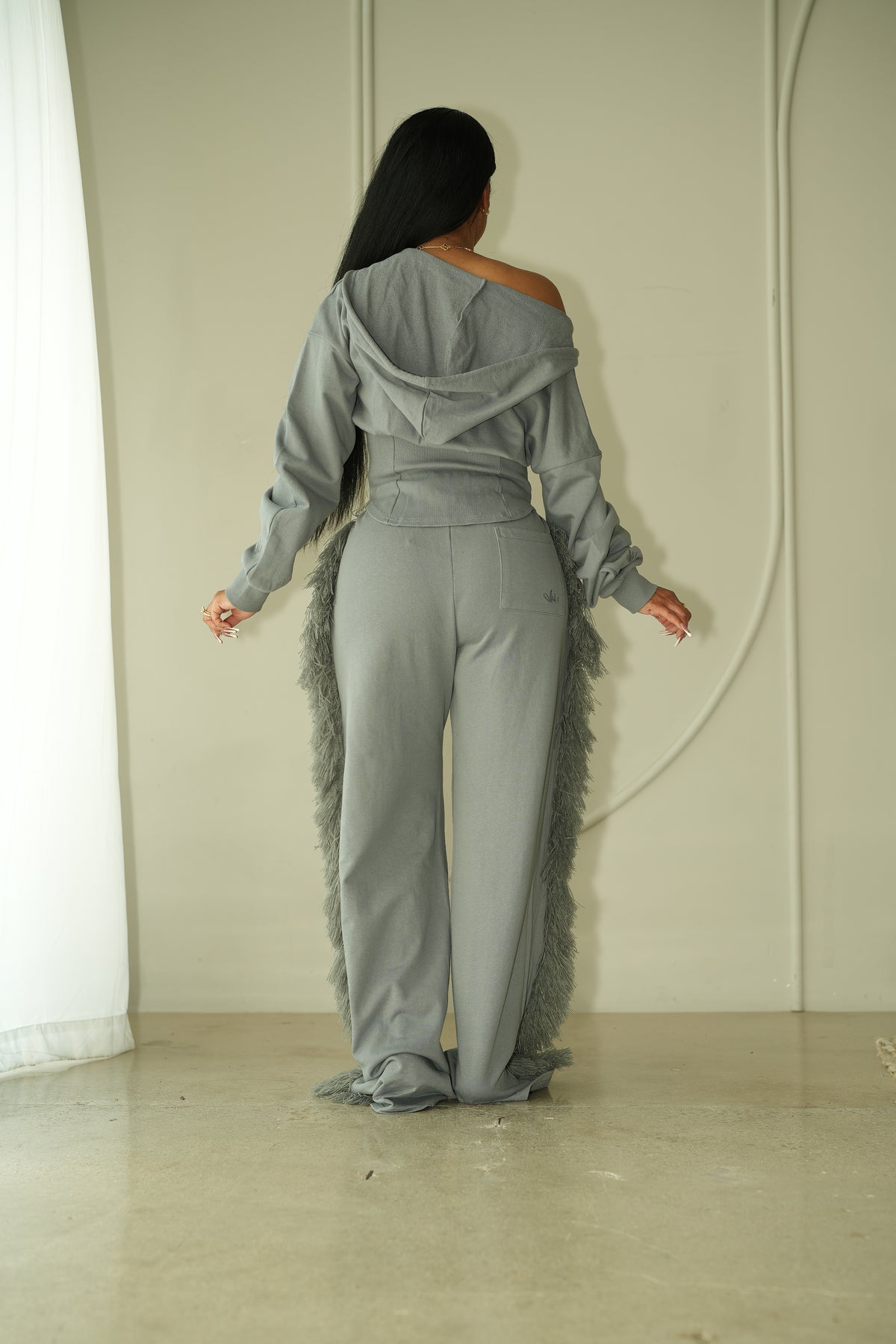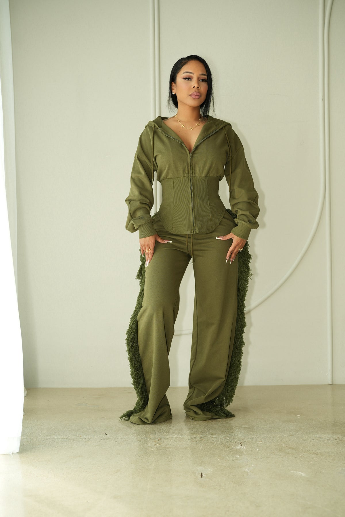 FRINGE PANTS. The pants have a relaxed wide fit. The waistband is thick and meant to cinch in your waistline. The dramatic fringe is a premium thick and fluffy thread meant to draw attention to your shape for an hour glass illusion. One butt pocket. Hand pockets. These pants alone are a statement piece.