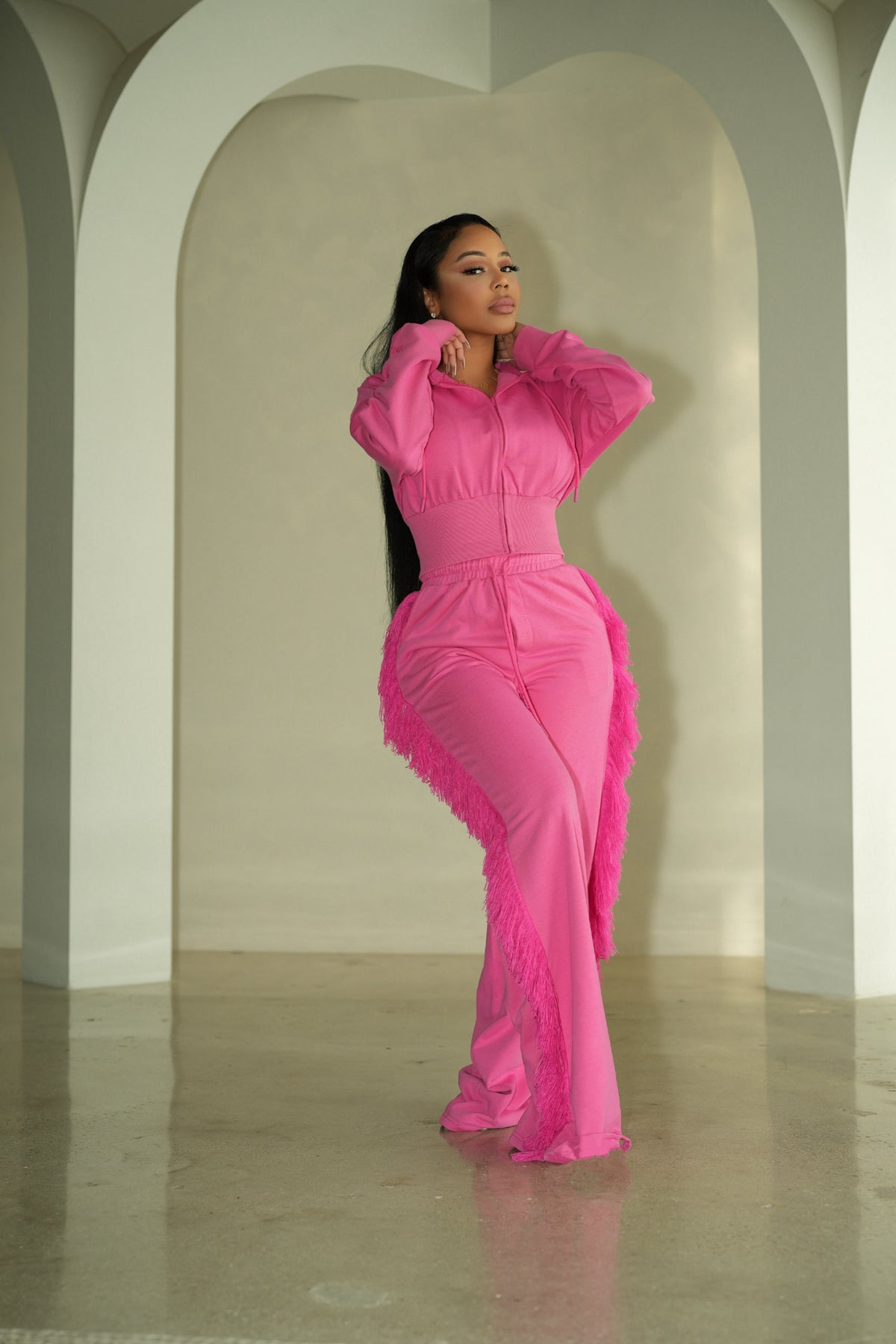 A CROPPED ZIPPER HOODIE JACKET available in pink only. This hoodie cinches your waistline in while still adding room and fluff to the bust shoulder and back area. Invisible zipper.