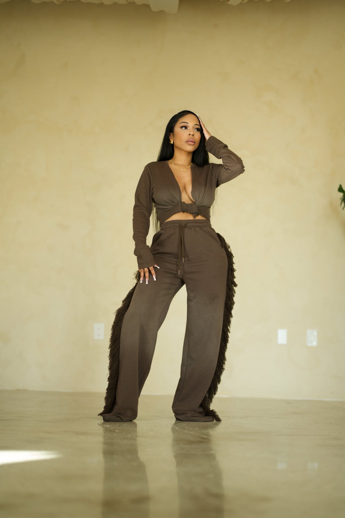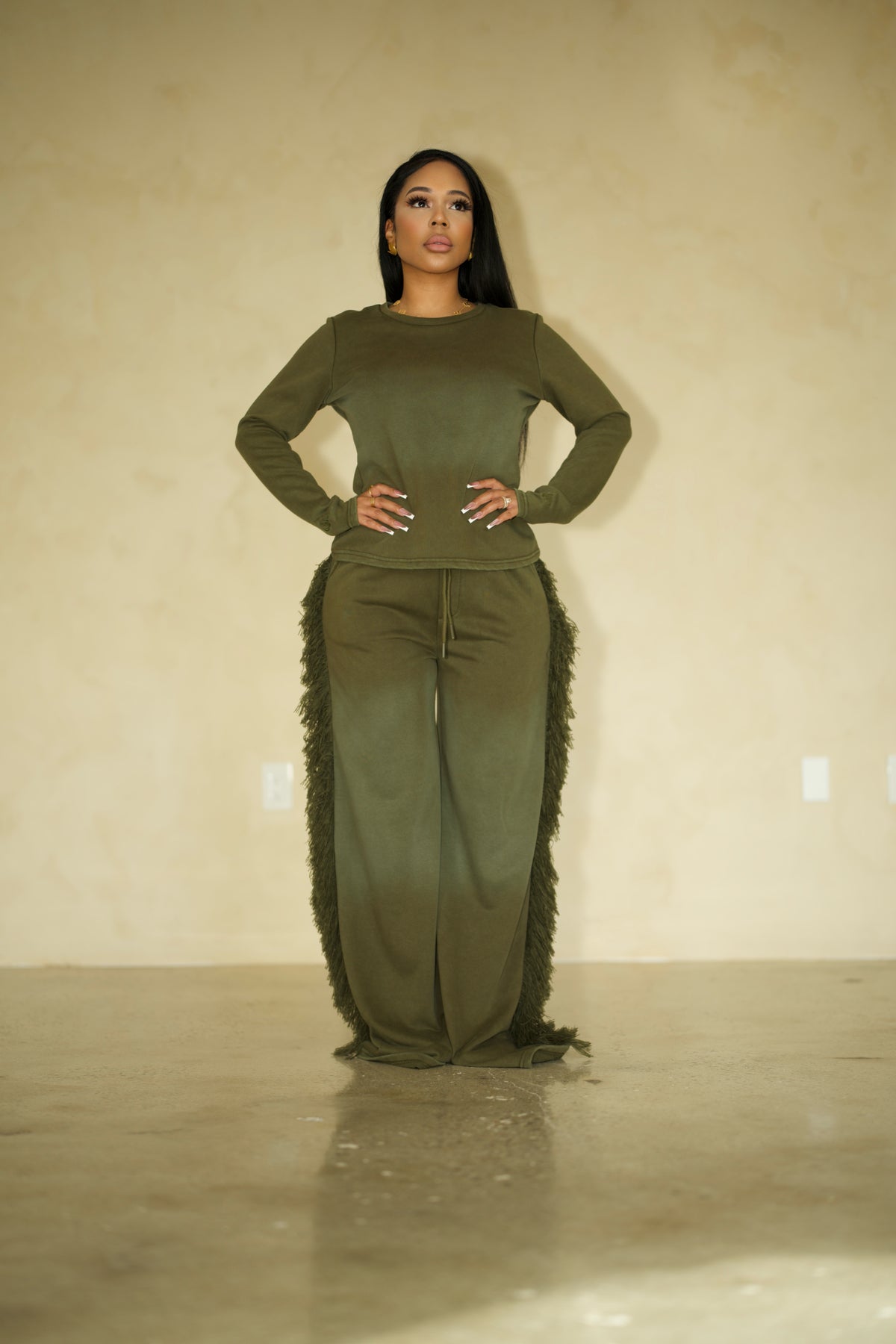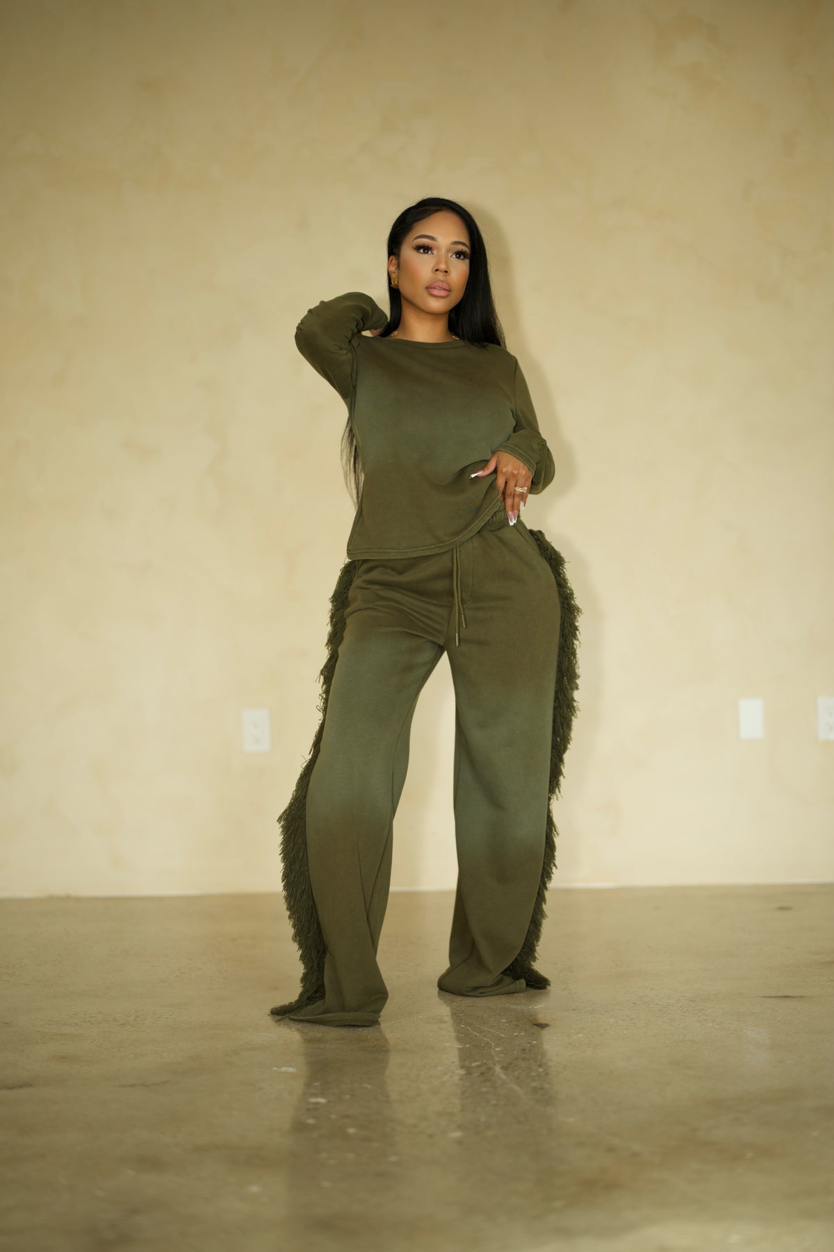 Relaxed fit Long sleeve T shirt meant to be paired with the matching fringe pants.