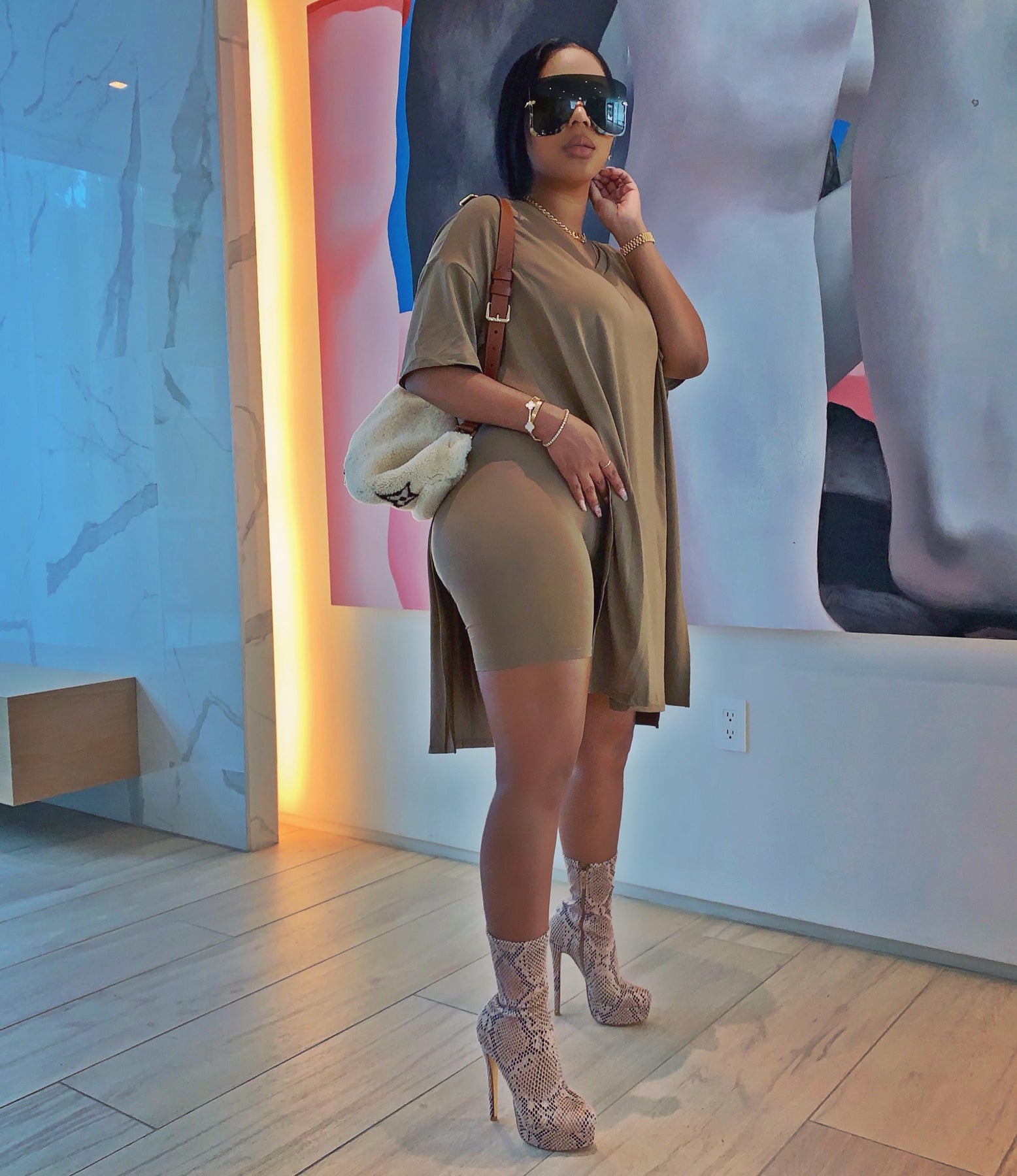 Loose long fit v neck tee with side slits. Matching high waist biker shorts. Stretchy slinky material. Tee fits long like a dress and has a wide fit.