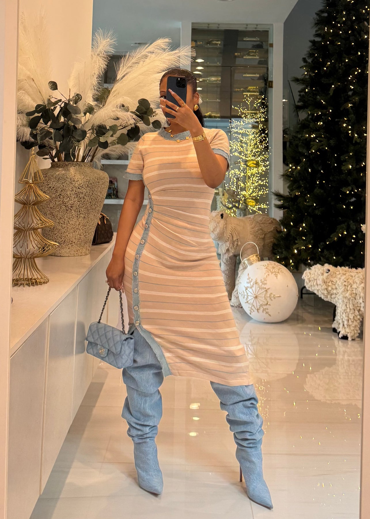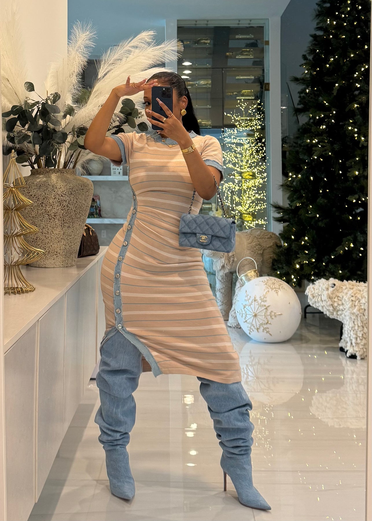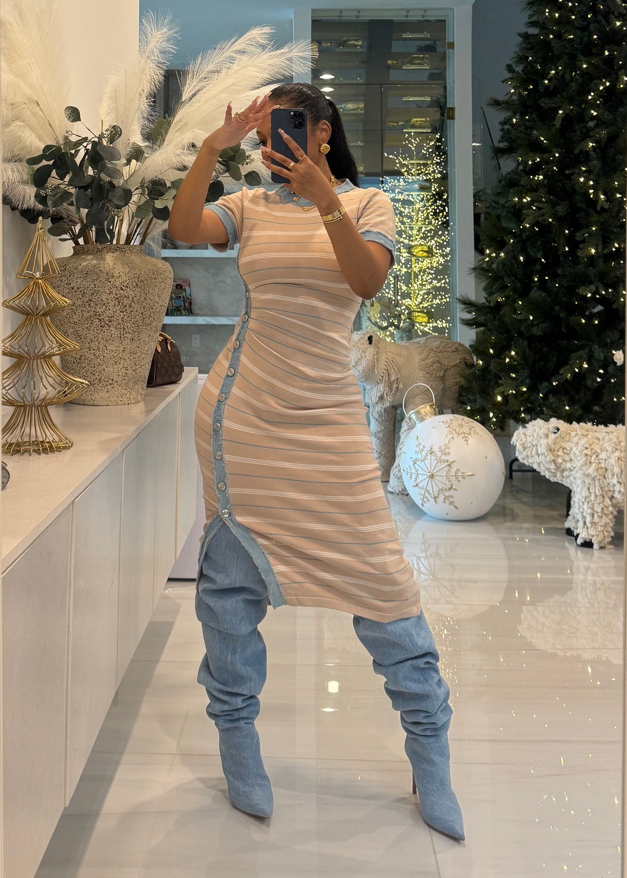 Bodycon dress with denim trim details and buttons