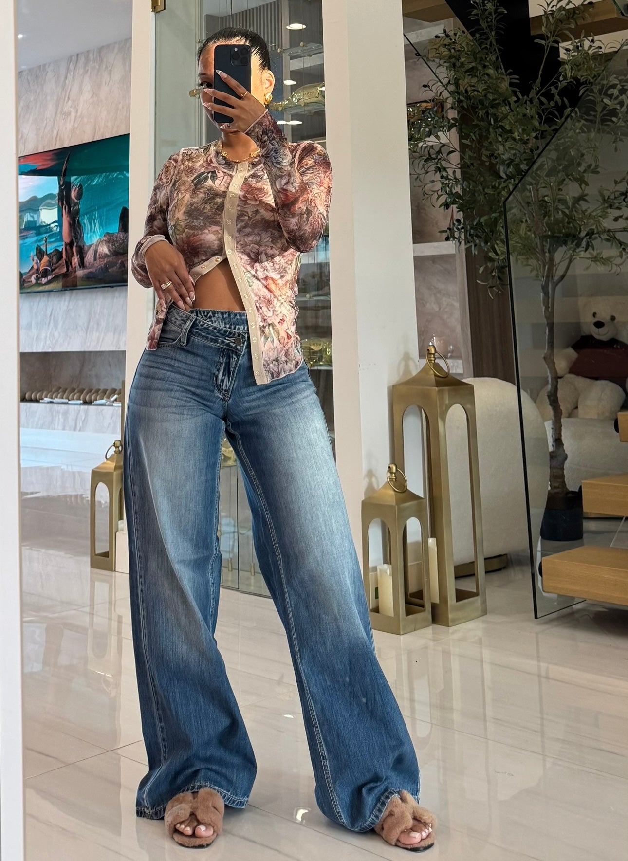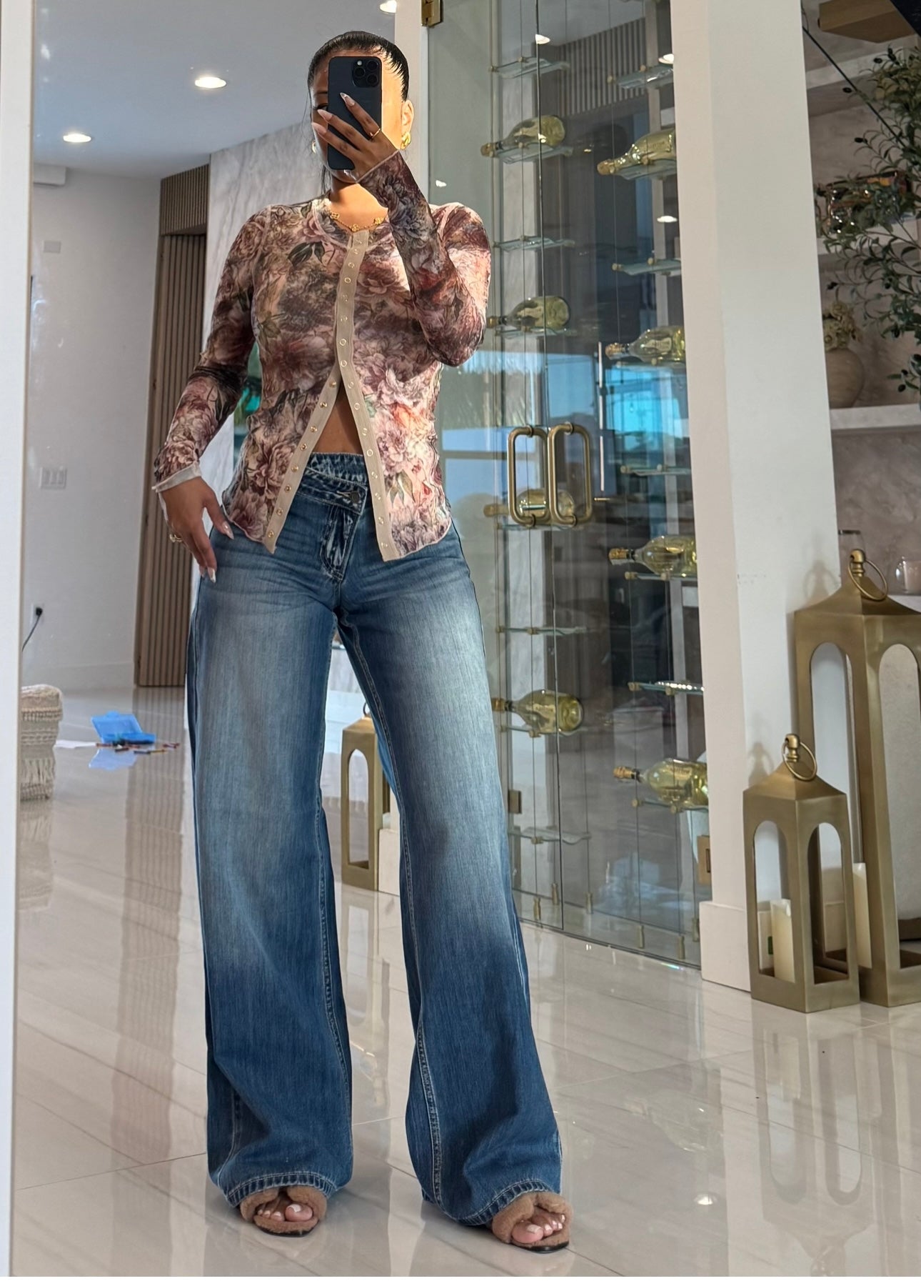 Mid right dark denim jeans with cross front button/zipper