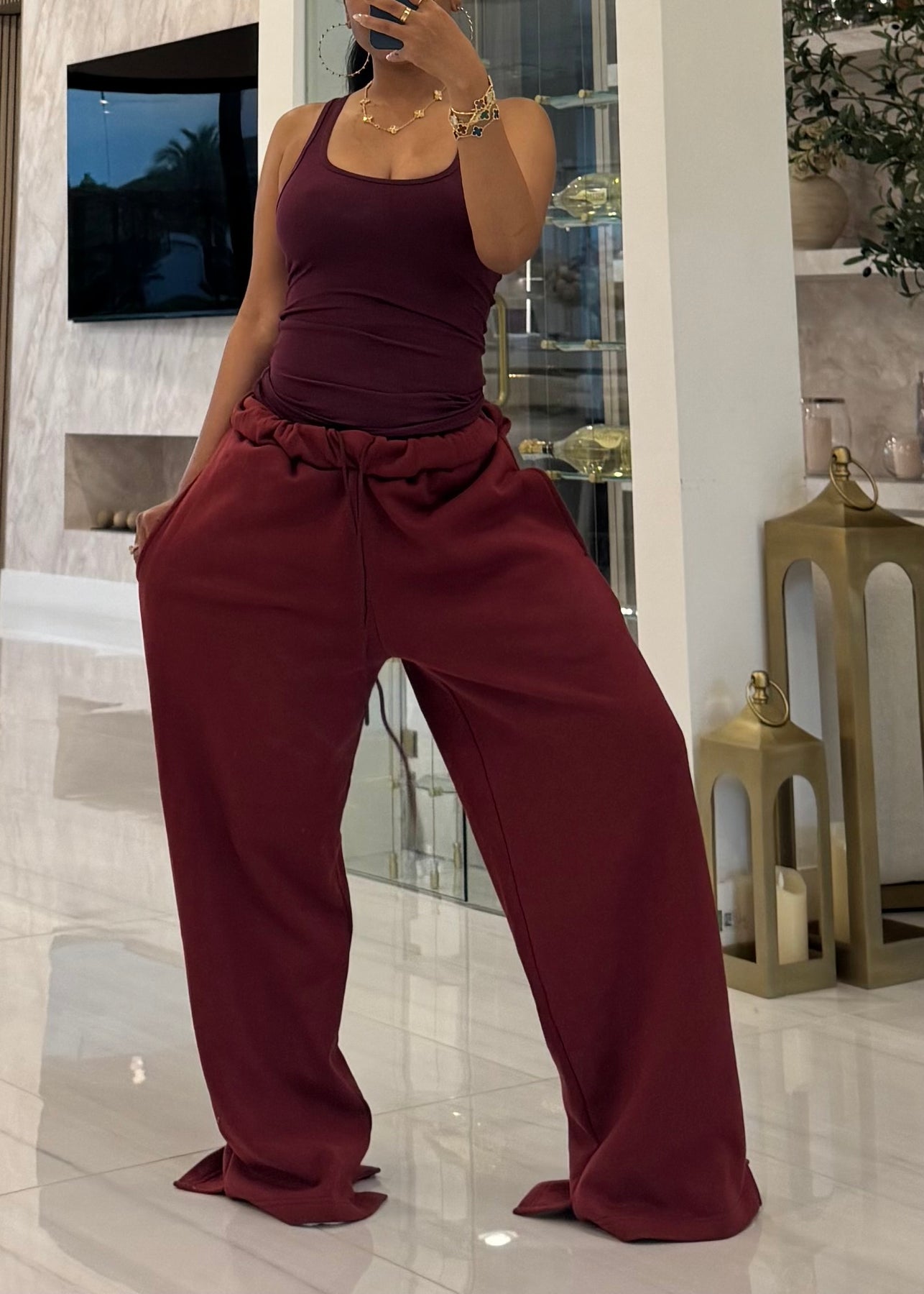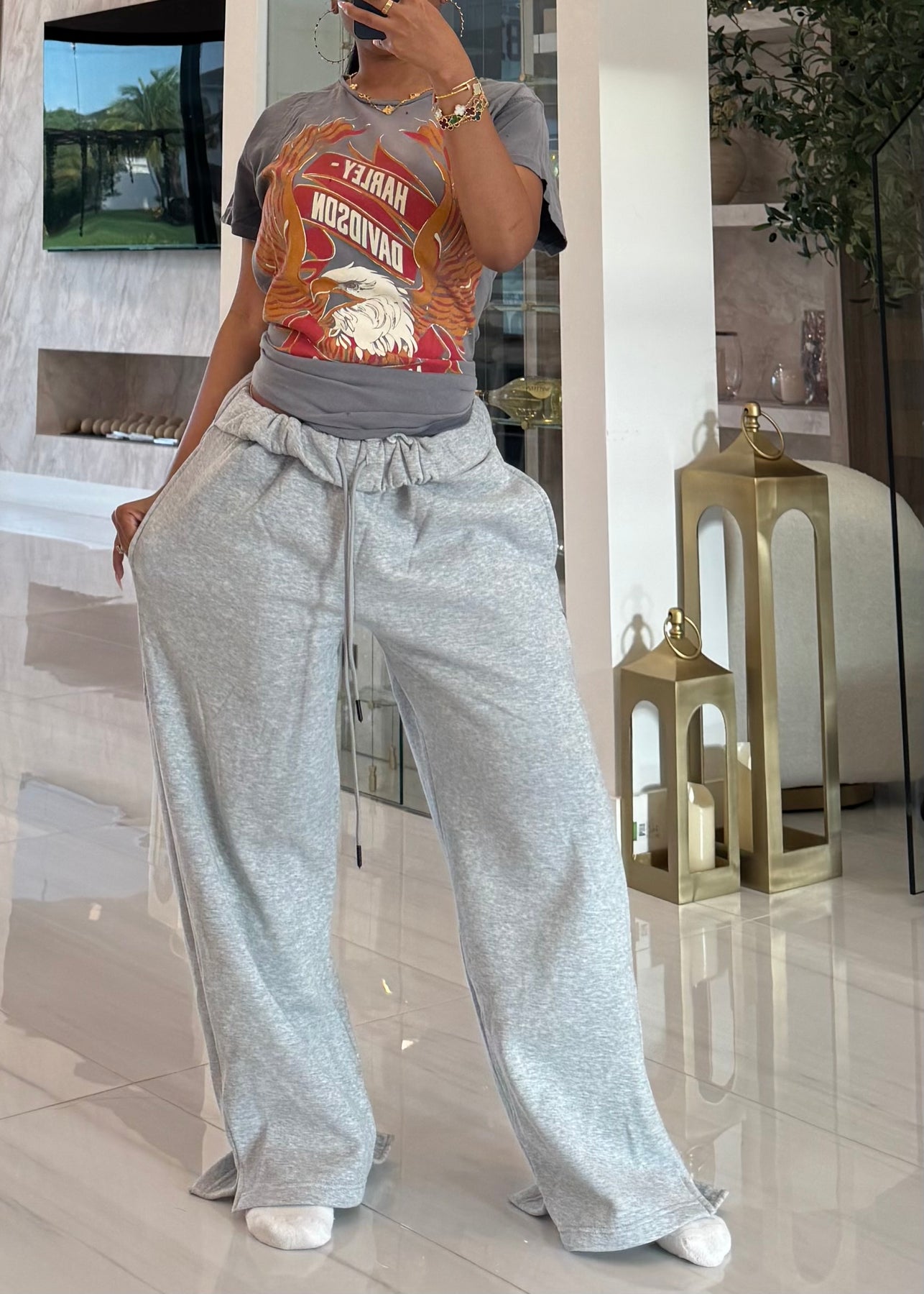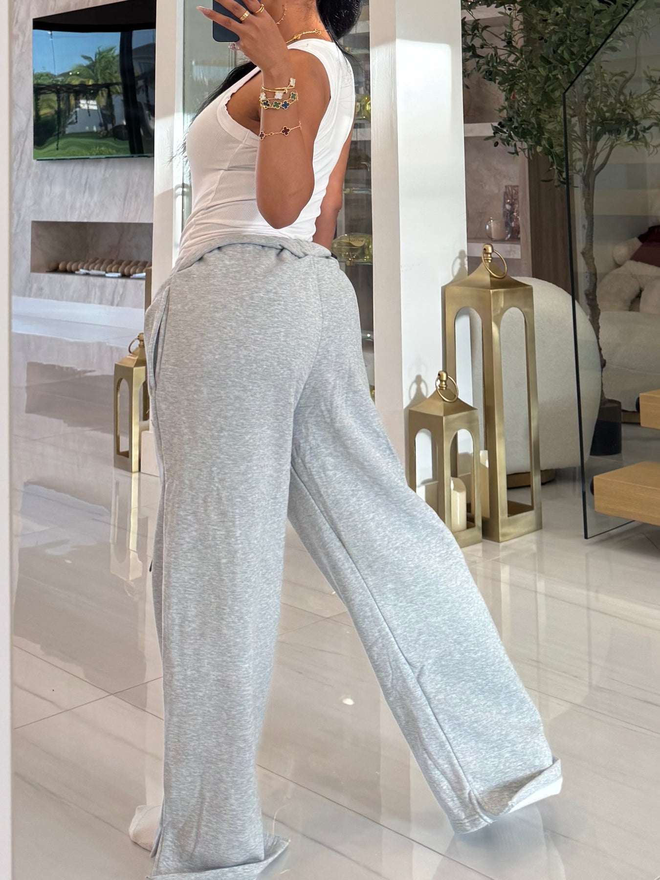 Relaxed/wide fit sweatpants with elastic waist dramatic rolled down detail.