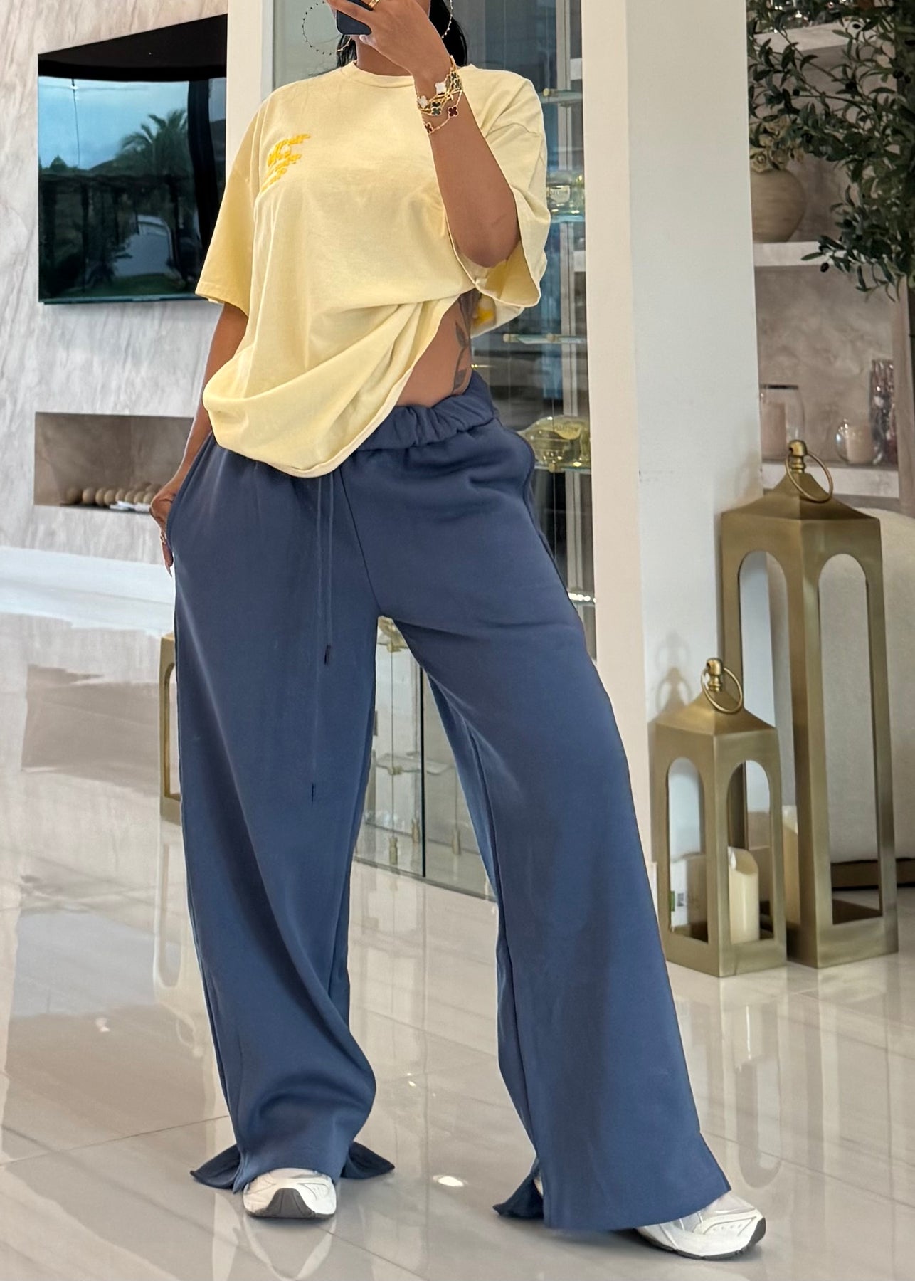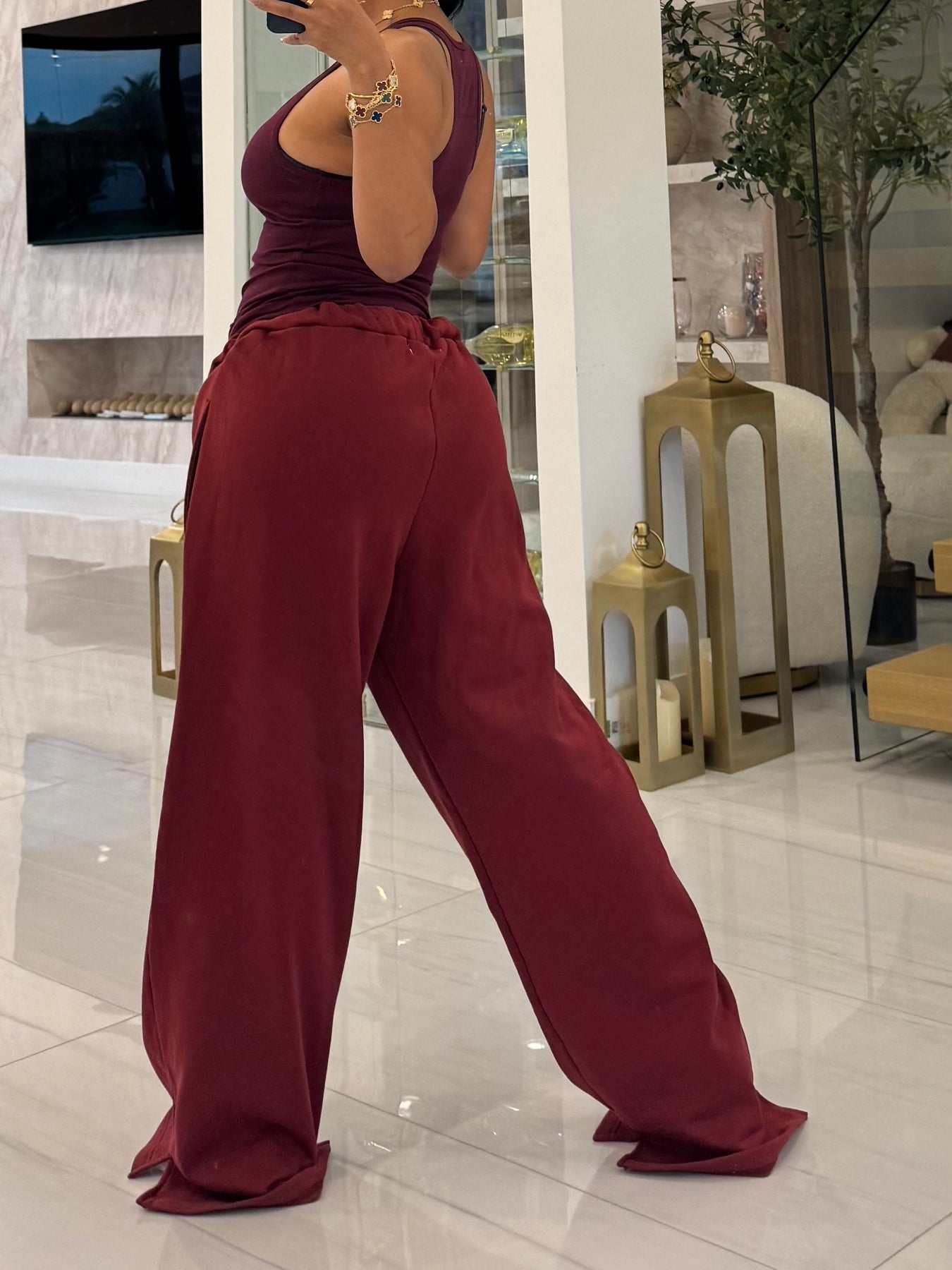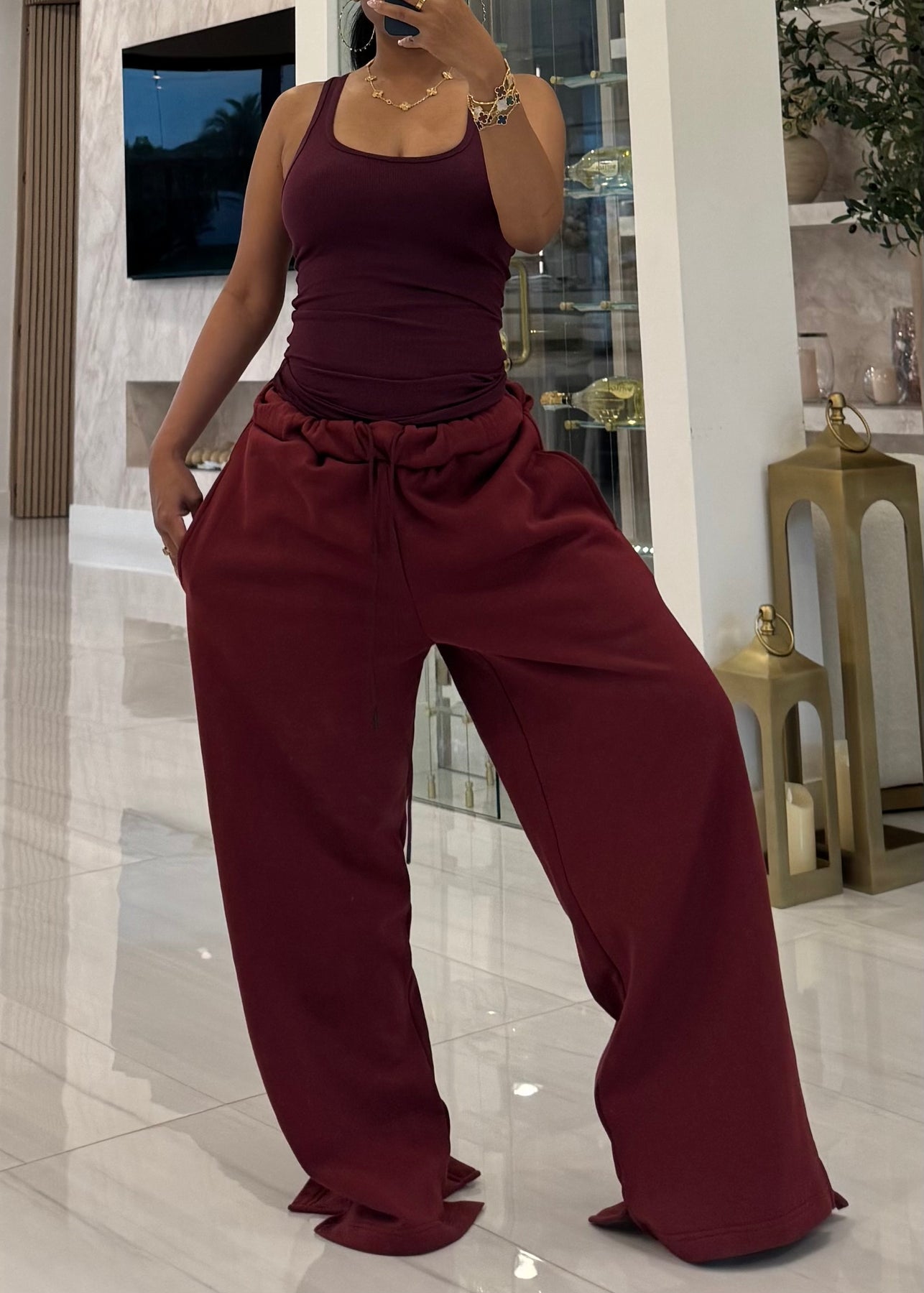 Relaxed/wide fit sweatpants with elastic waist dramatic rolled down detail.