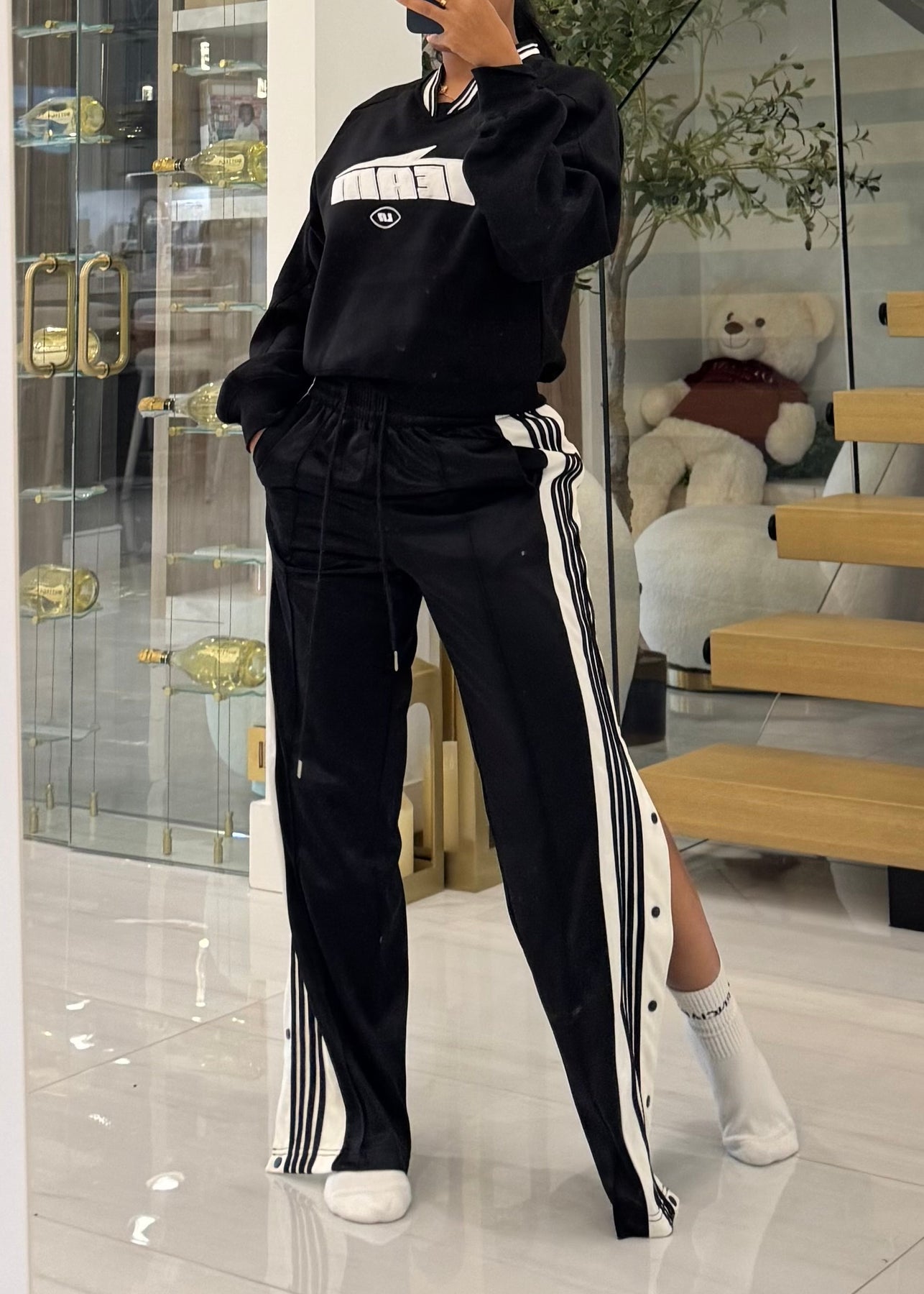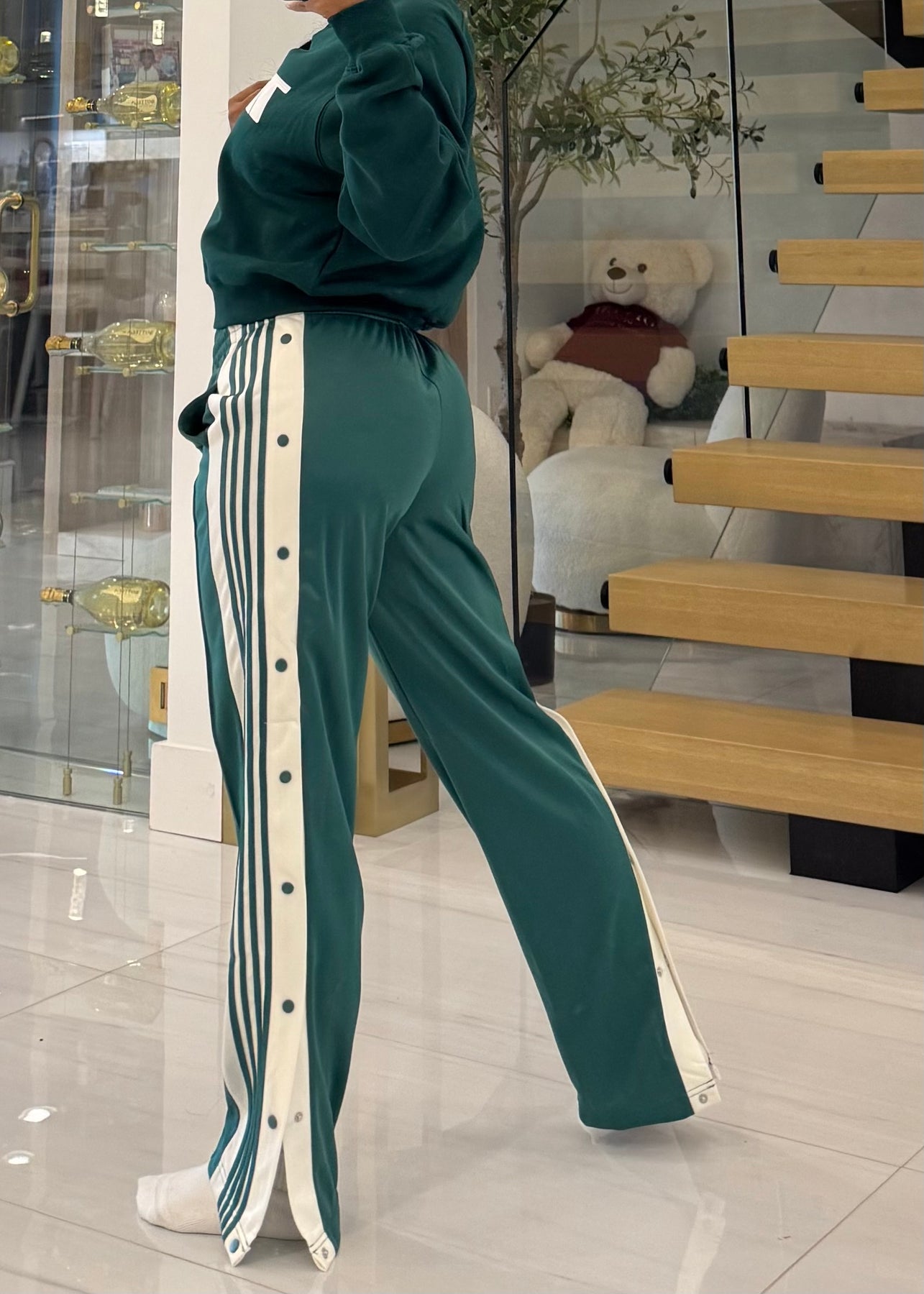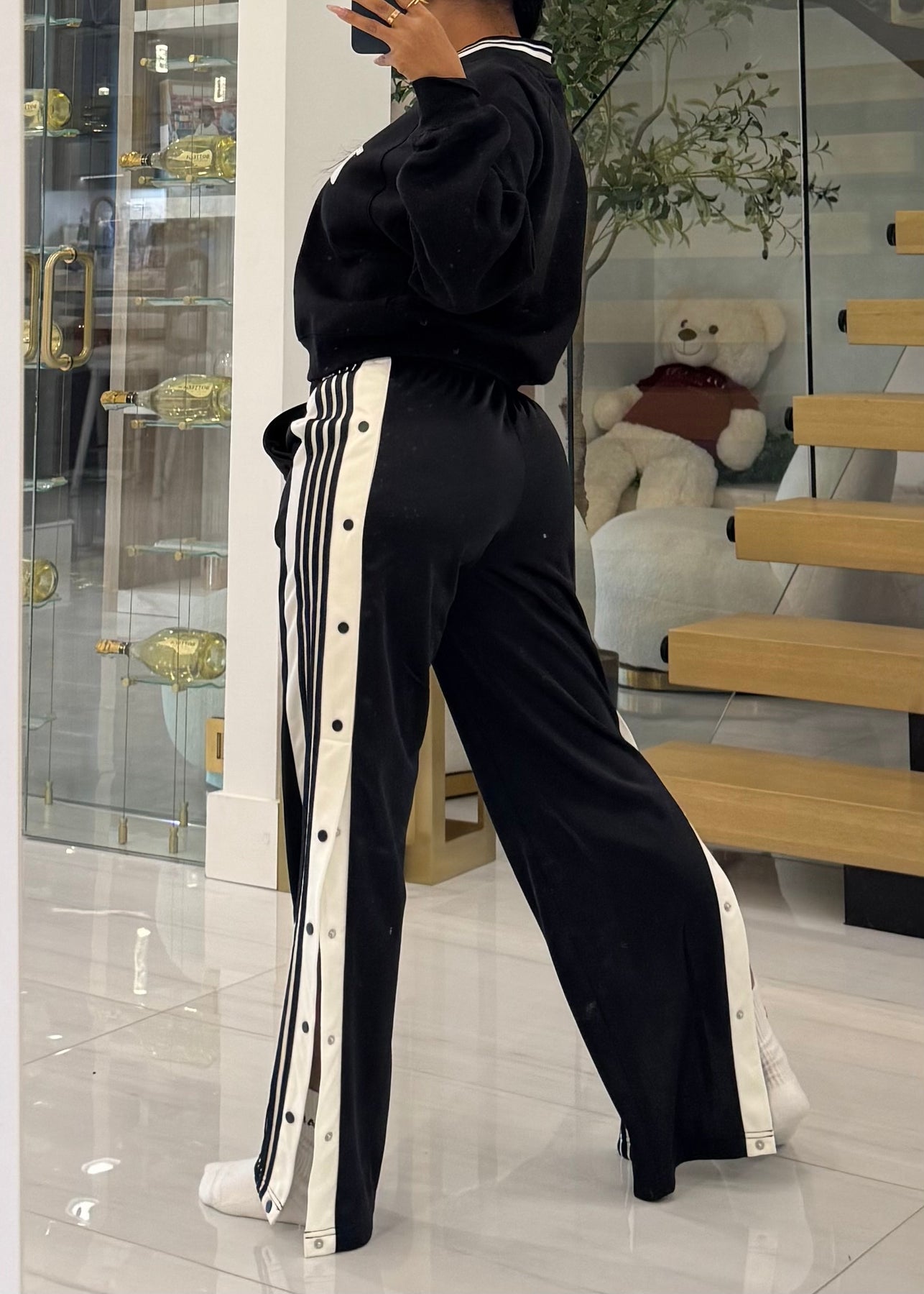 Snap tracks have elastic waistline and functional drawstring. Crease detail down middle and lined detail down sides of pants with functional snaps up to calf. Hand pockets. Soft shiny mid weight track material. No stretch but room to give.