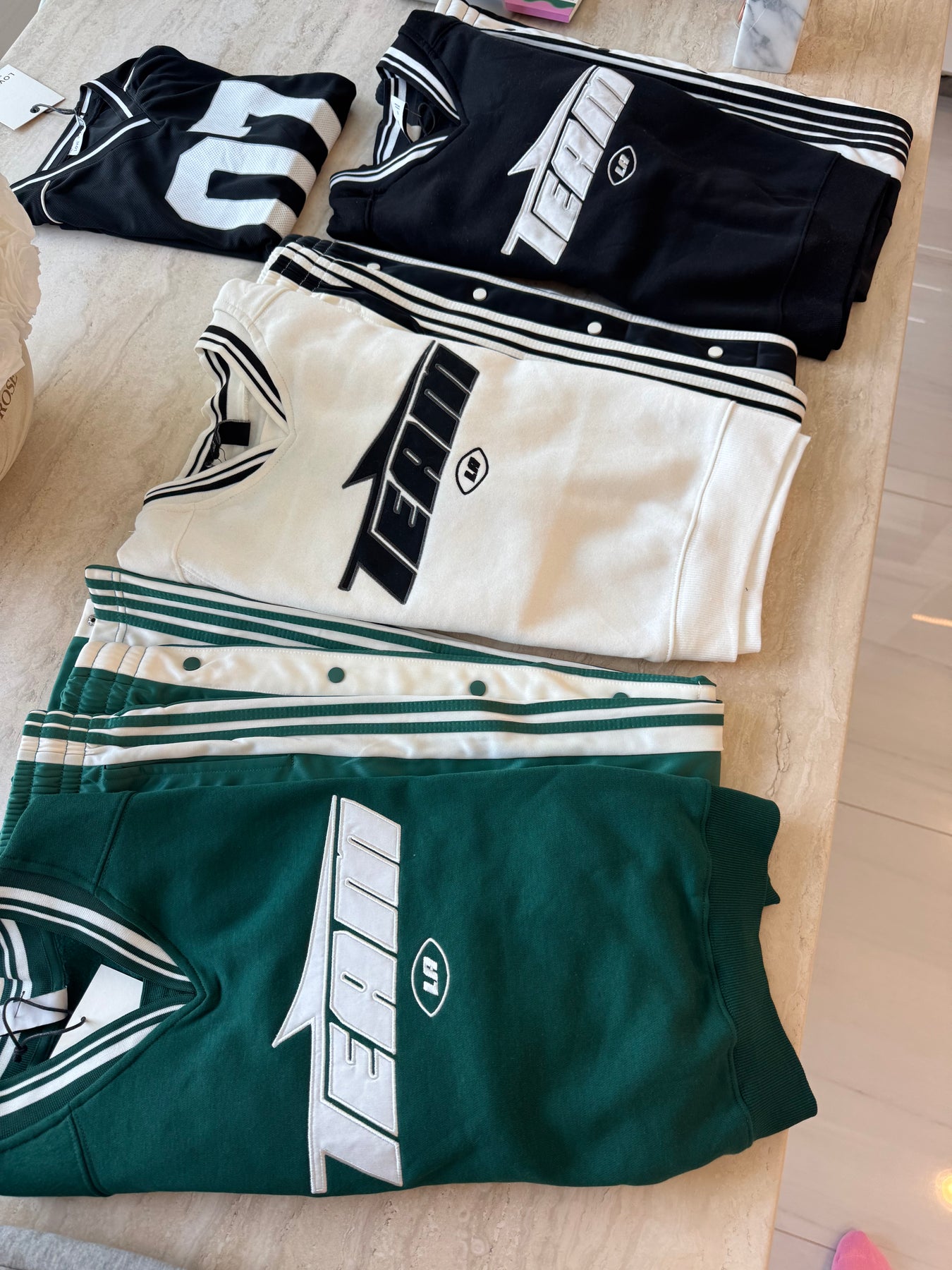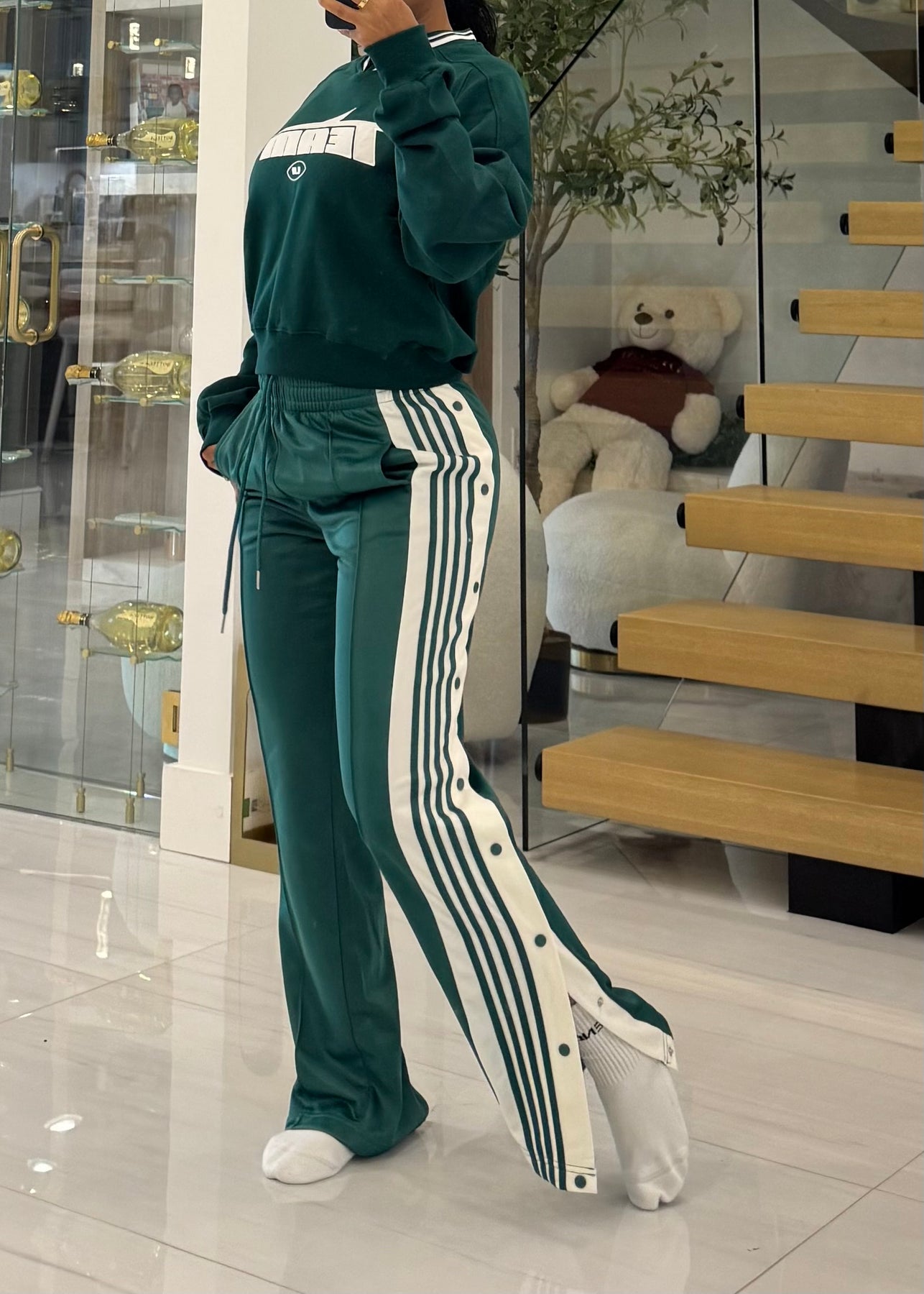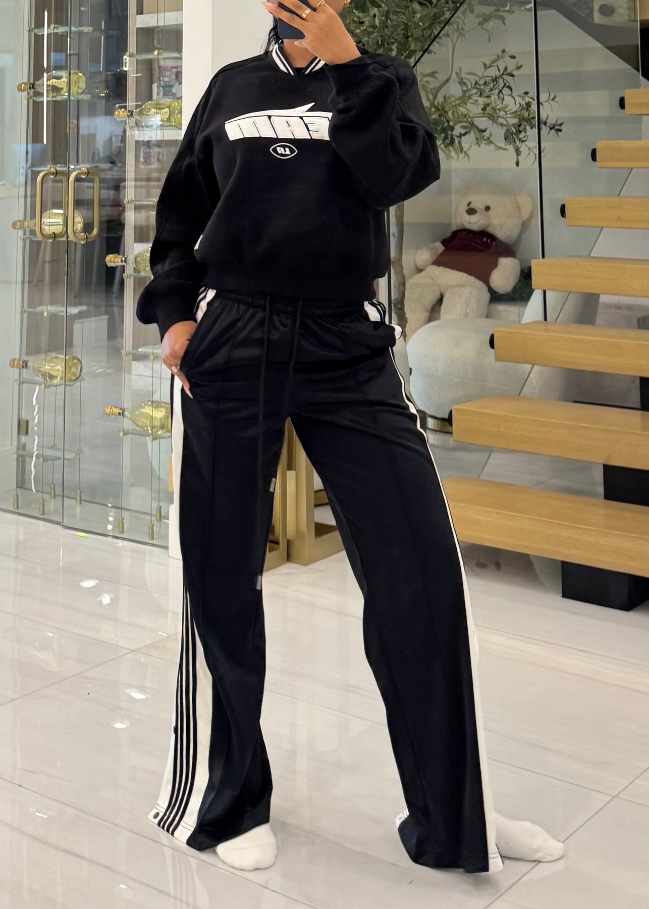 Snap tracks have elastic waistline and functional drawstring. Crease detail down middle and lined detail down sides of pants with functional snaps up to calf. Hand pockets. Soft shiny mid weight track material. No stretch but room to give.