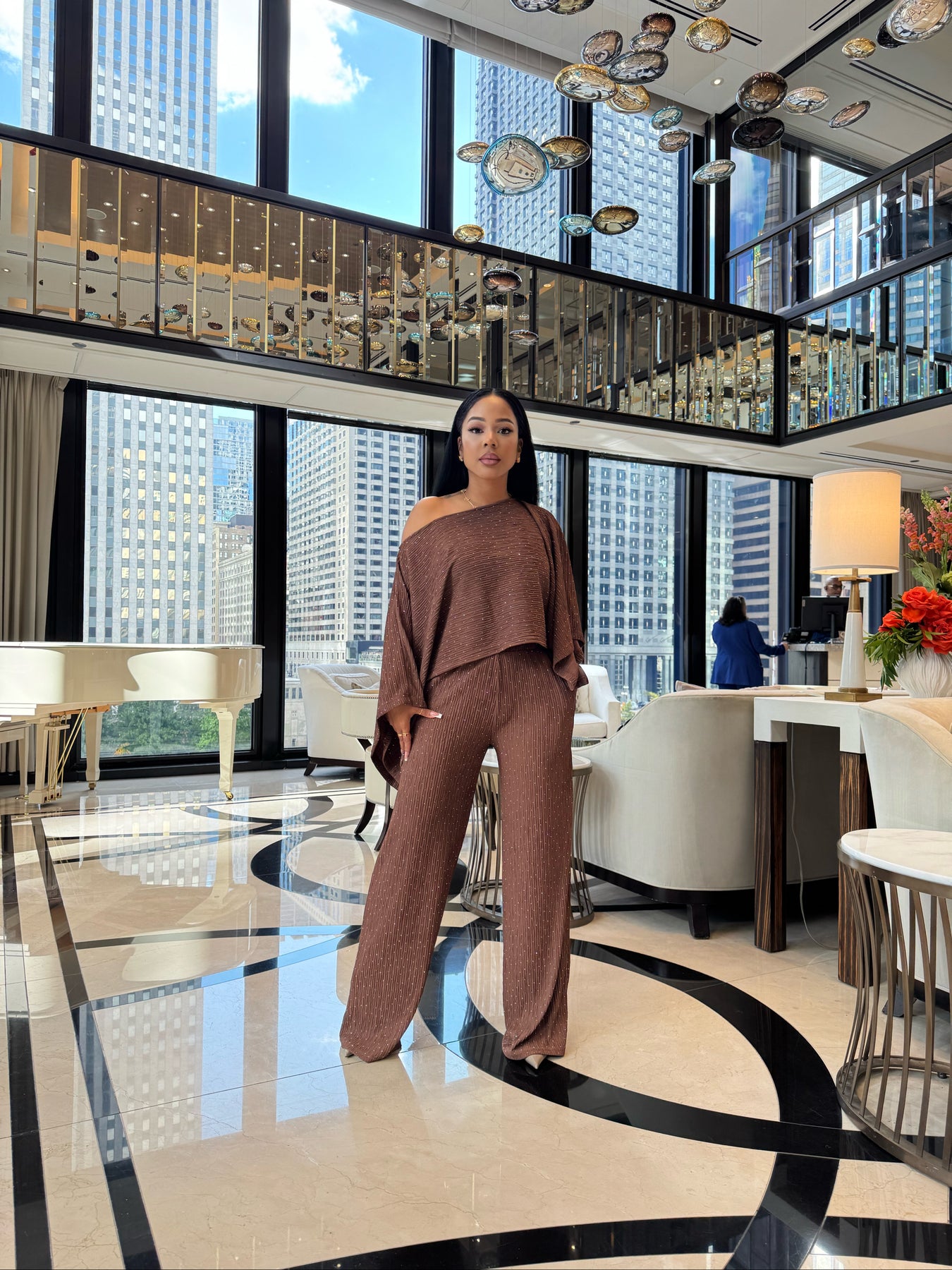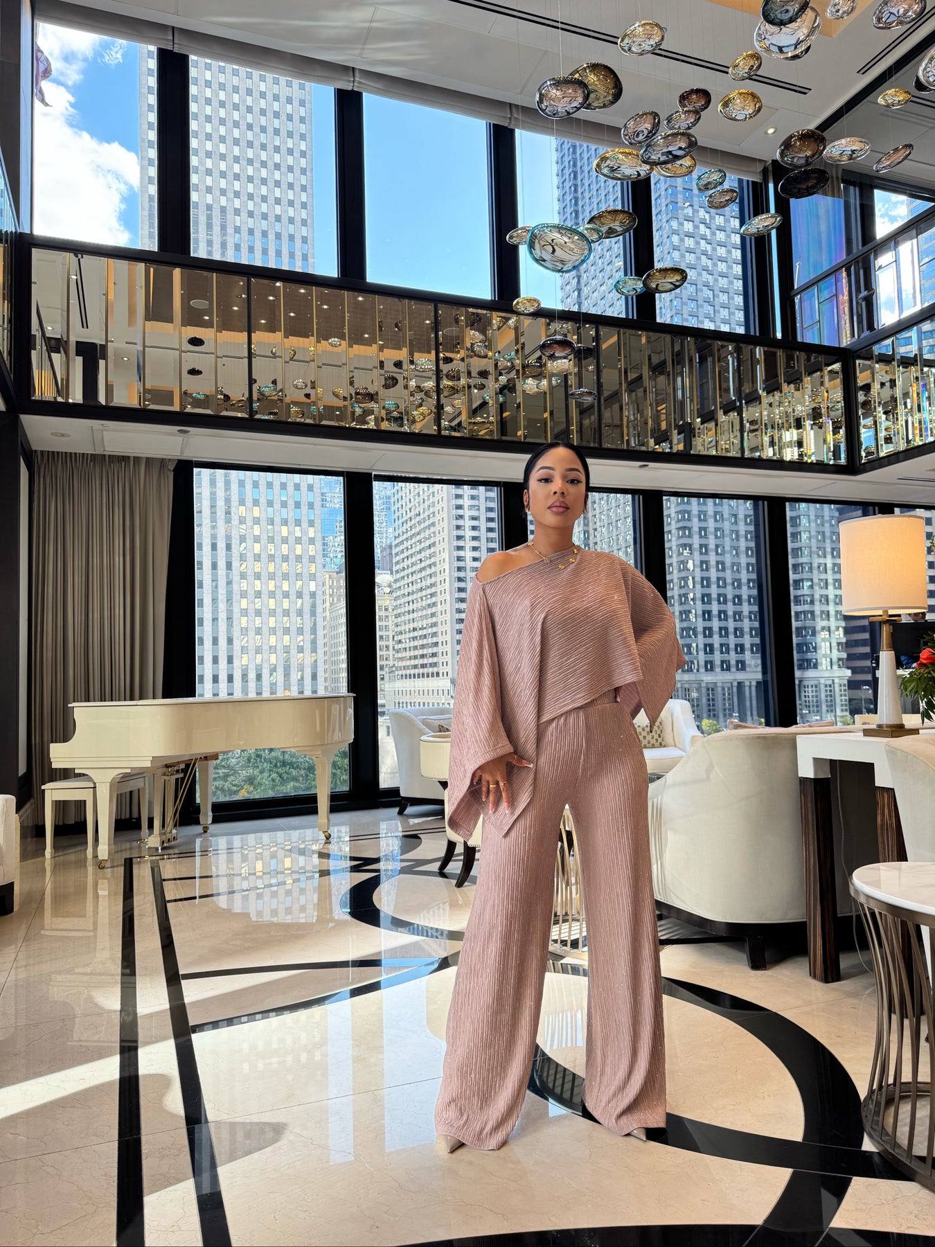 2 piece set mid weight pleated material with rhinestones all over front and back