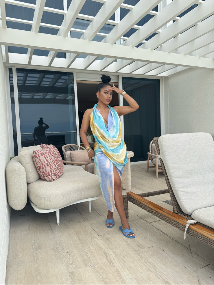 Deep Cut Draped Halter with Big Bead Detail Round Neck
